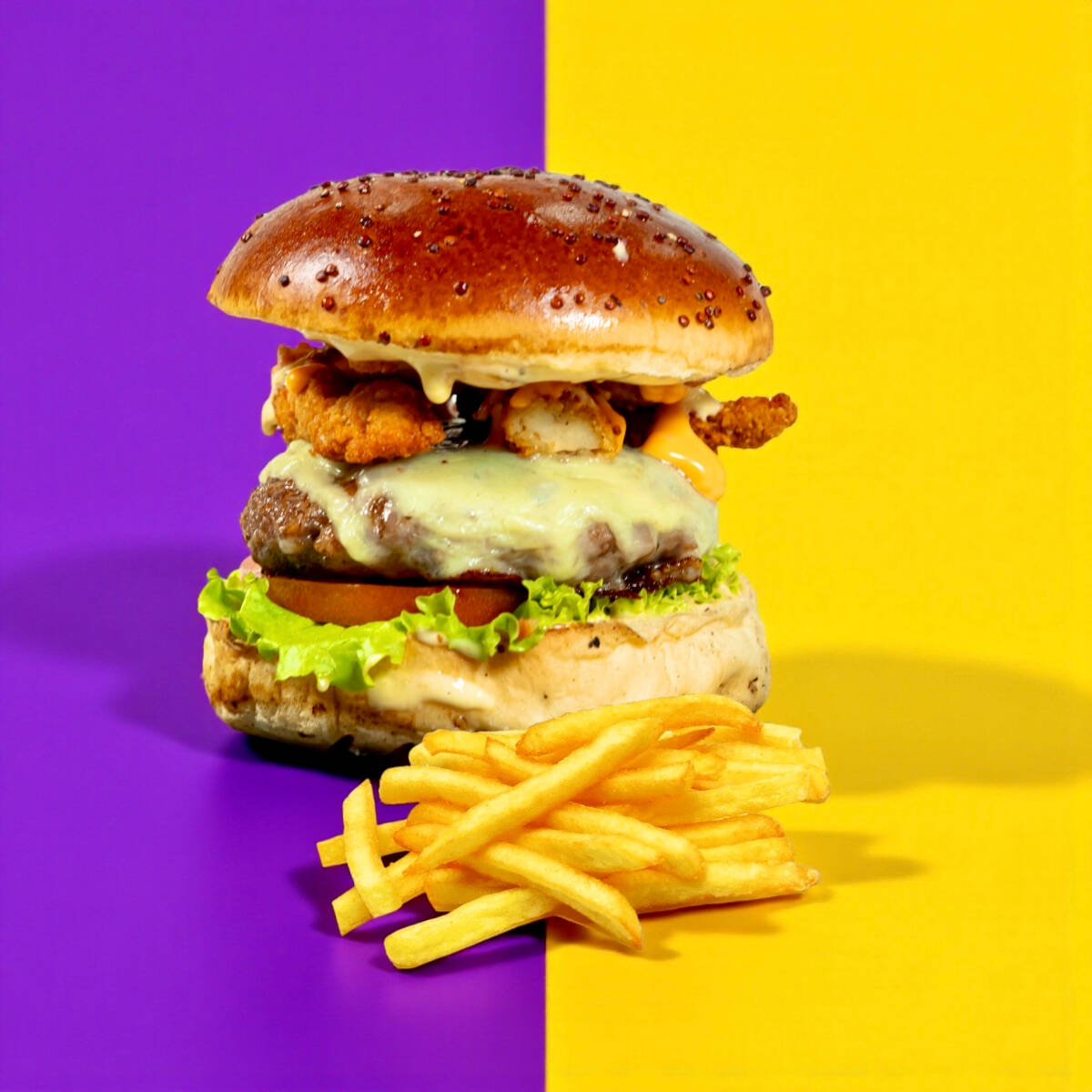 Pan brioche, 90 gr carne de la casa, tiras de pollo tender, tomate, cebolla, lechuga, queso mozzarella, cheddar, papas fritas y salsas de la casa.