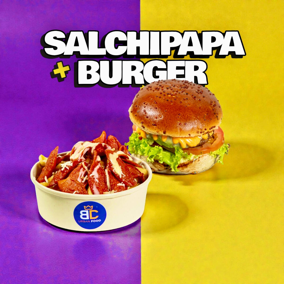 Combo salchipapa sencilla de 170 gr de papas y hamburguesa clasica de 90 gr de carne (pesentacion mediana)