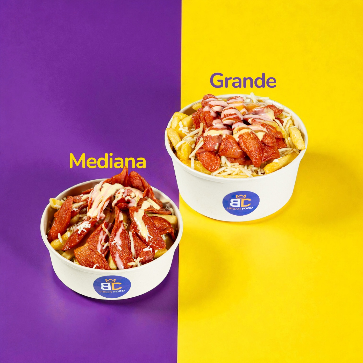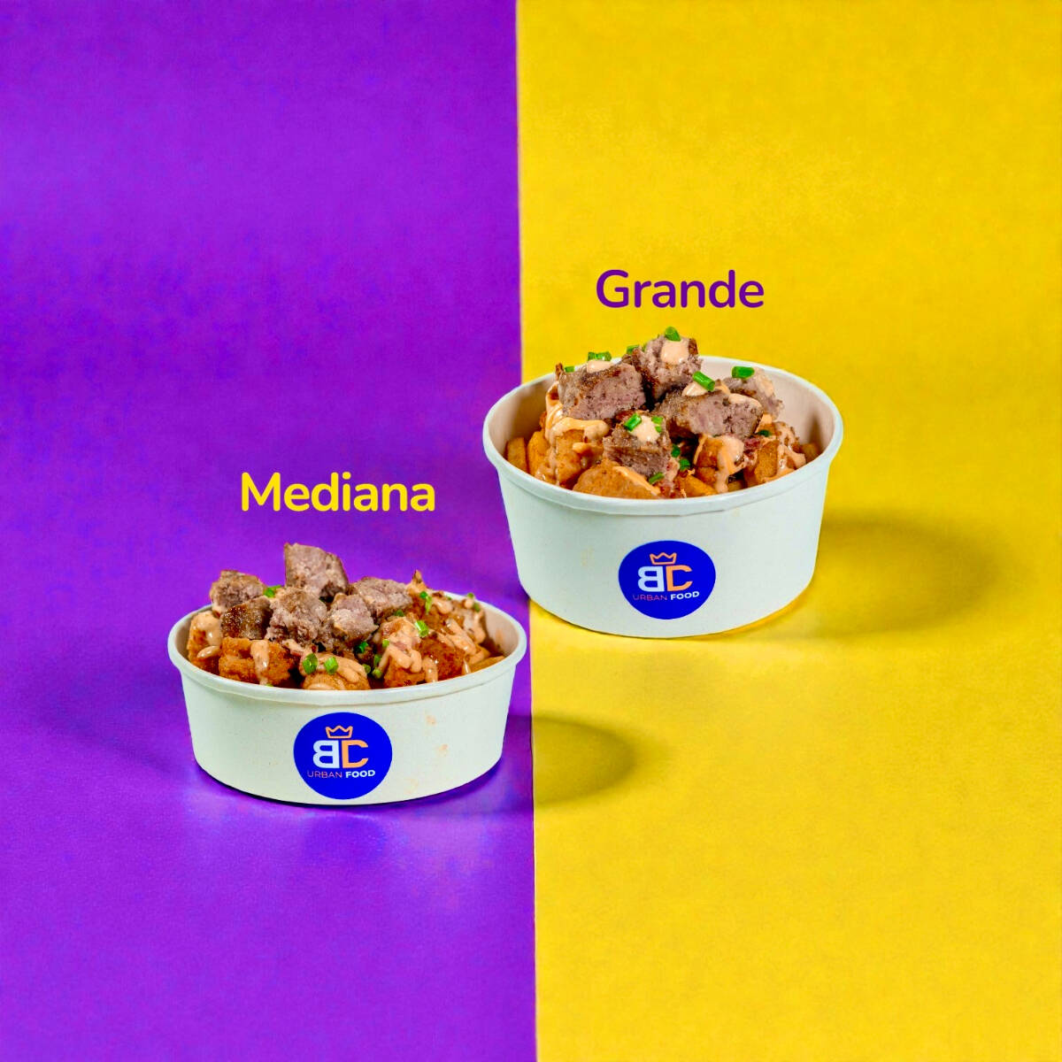 Bowld 170 gr de papas fritas, cebollín chino en trocitos, pollo tener, carne de hamburguesa, salsa urban de la casa y salsa cheddar.