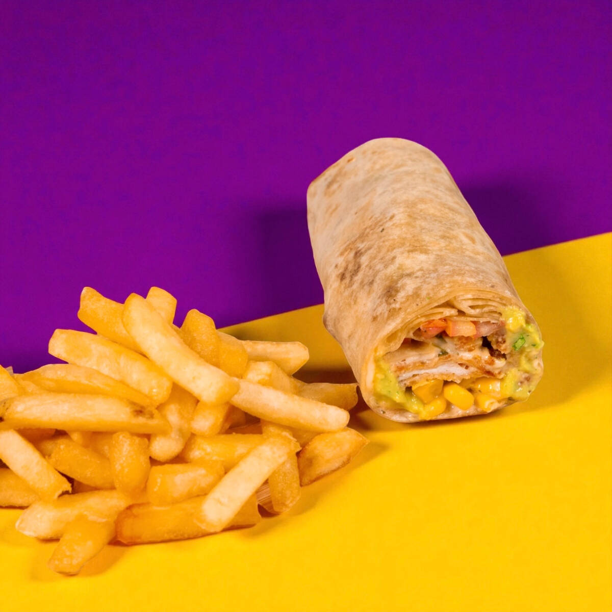 Tortilla de harina, lechuga, tomate, queso mozzarella, tiras de pollo salteado, salsa de la casa, papas fritas y salsa ranch para acompañar.