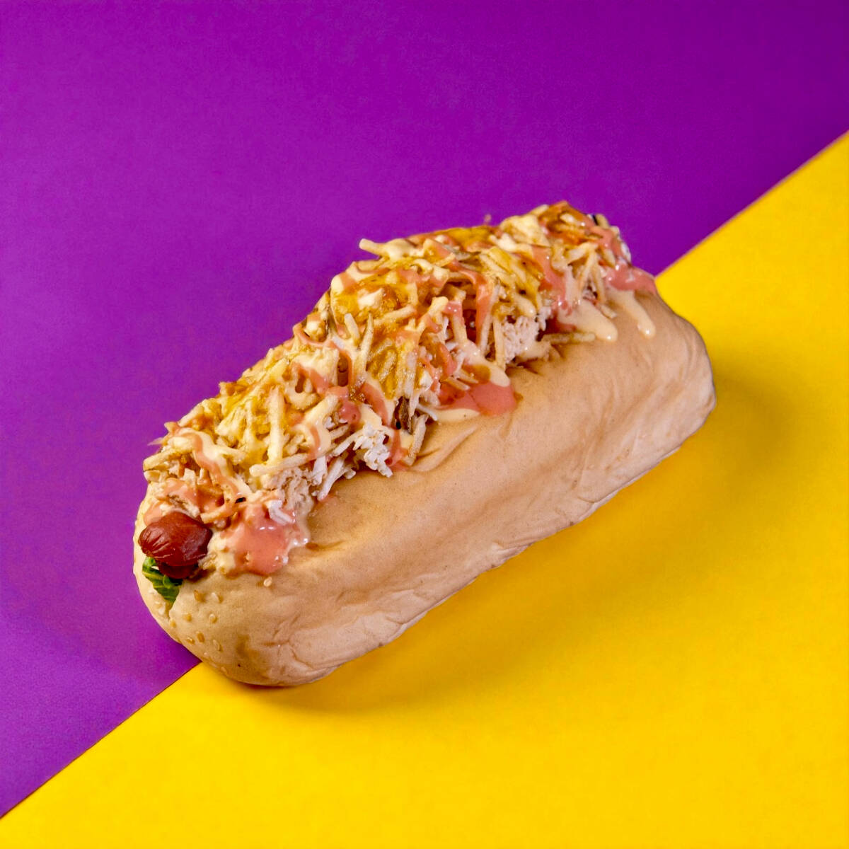 Pan especial de mantequilla, salchicha tradicional, pollo tender en trocito, tocineta, queso costeño, chongo, piña caramelizada, lechuga y salsas de la casa