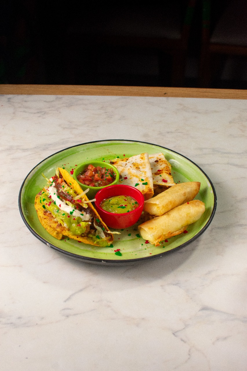 Un mini burrito tradicional, una enchilada, dos mini quesadillas, dos flautas de queso y nachos Benito Juárez.