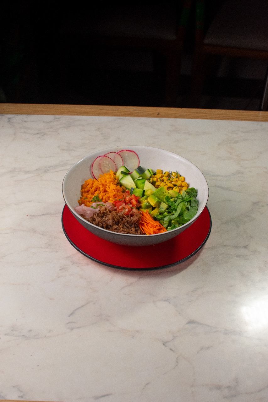Bowl con carne Birria, vegetales: Pepino, rábano, zanahoria, aguacate, pico de gallo, maíz tierno, lechuga romana. Salsa y arroz a elección.