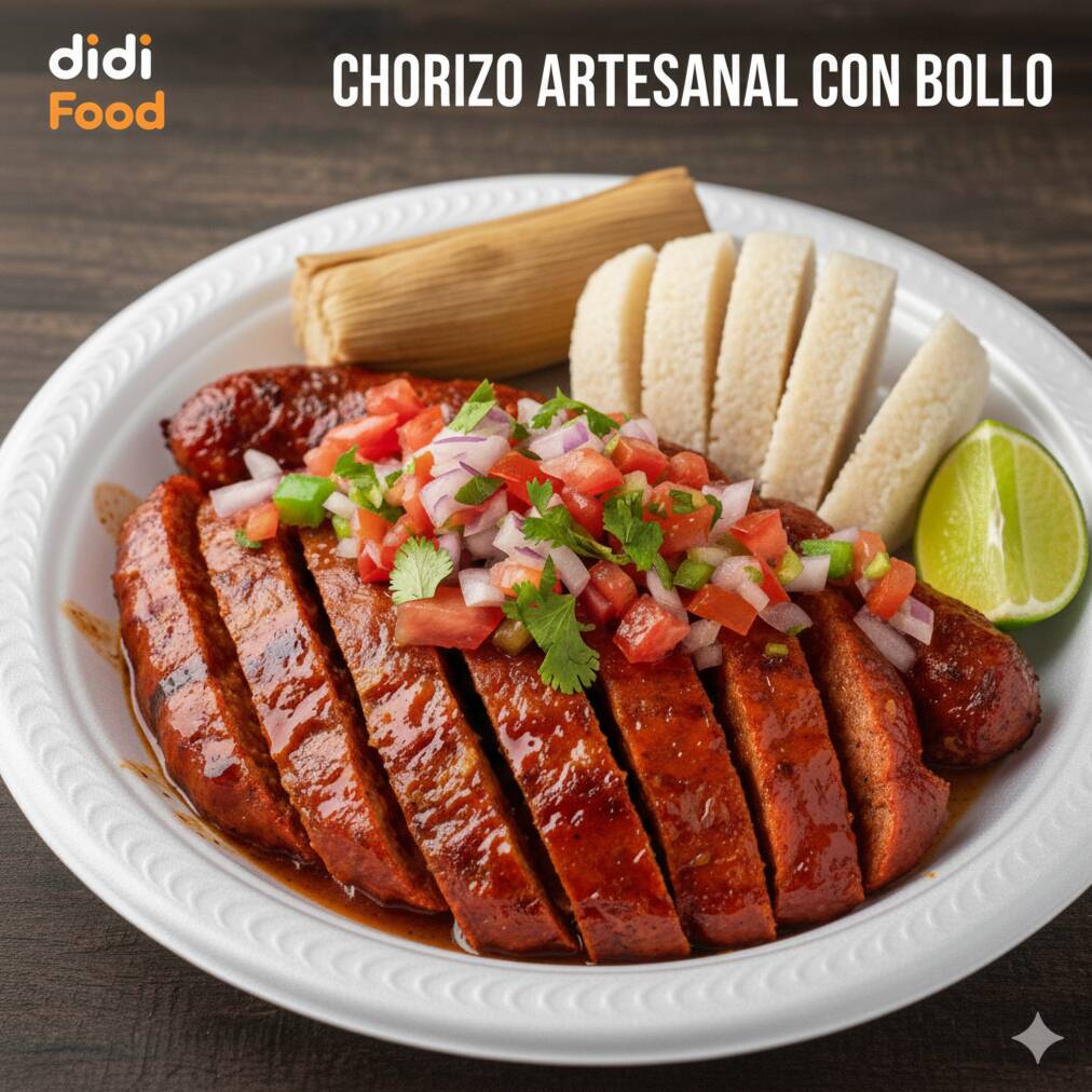 Chorizo artesanal de la región, asado y cortado en julianas, acompañado de bollo tradicional picado y pico de gallo. Sabor casero con una presentación impecable.