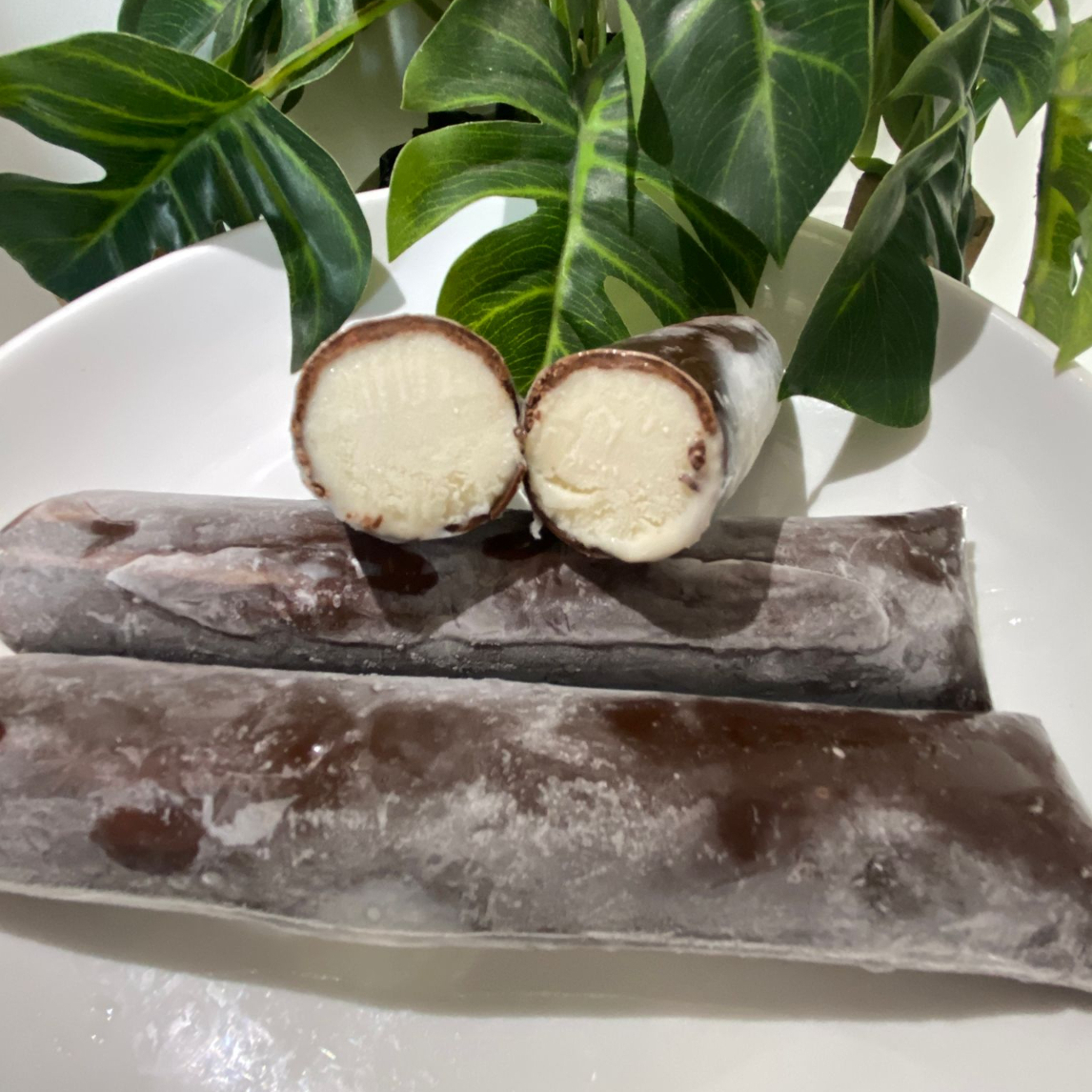 Choco Vainilla 🍦🍫 Cremoso helado de vainilla cubierto de irresistible chocolate. Como un chococono… ¡pero sin cono!