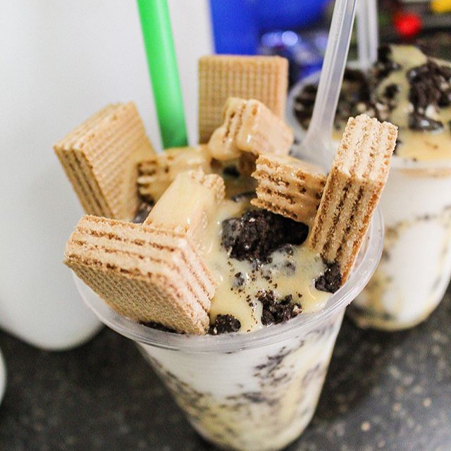 DELICIOSA MALTEADA DE CAFE MOKA, Y HELADO DE VAINILLA CON TOPPING DE GALLETAS DE CHOCOLATE Y SIROPPE