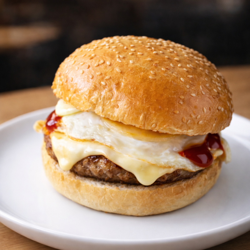 DELICIOSA HAMBURGUESA ELABAORADA CON JUGOSA CARNE DE RES ACOMPAÑADO CON CEBOLLA FRESCA Y TOMATE SE COMPLEMENTA CON UN HUEVO FRITO Y UNA LONCHA DE QUESO CREMOSO MAS SUS SALSAS CLASICAS IDEAL PARA LOS AMANTES DE LAS HAMBURGUESAS