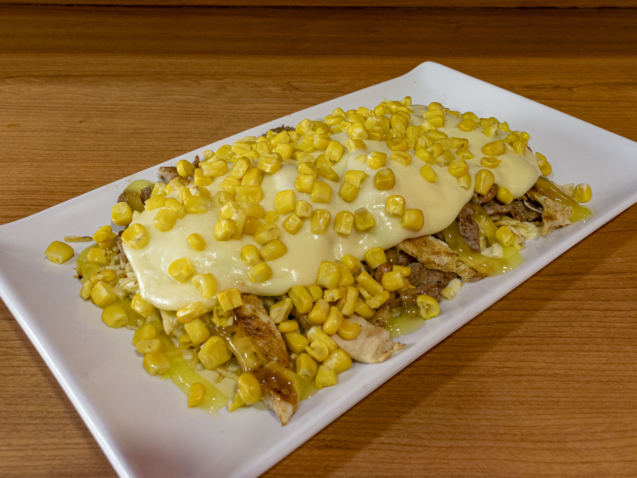 Maíz, pollo, carne de res, queso mozzarella, papa chongo.
