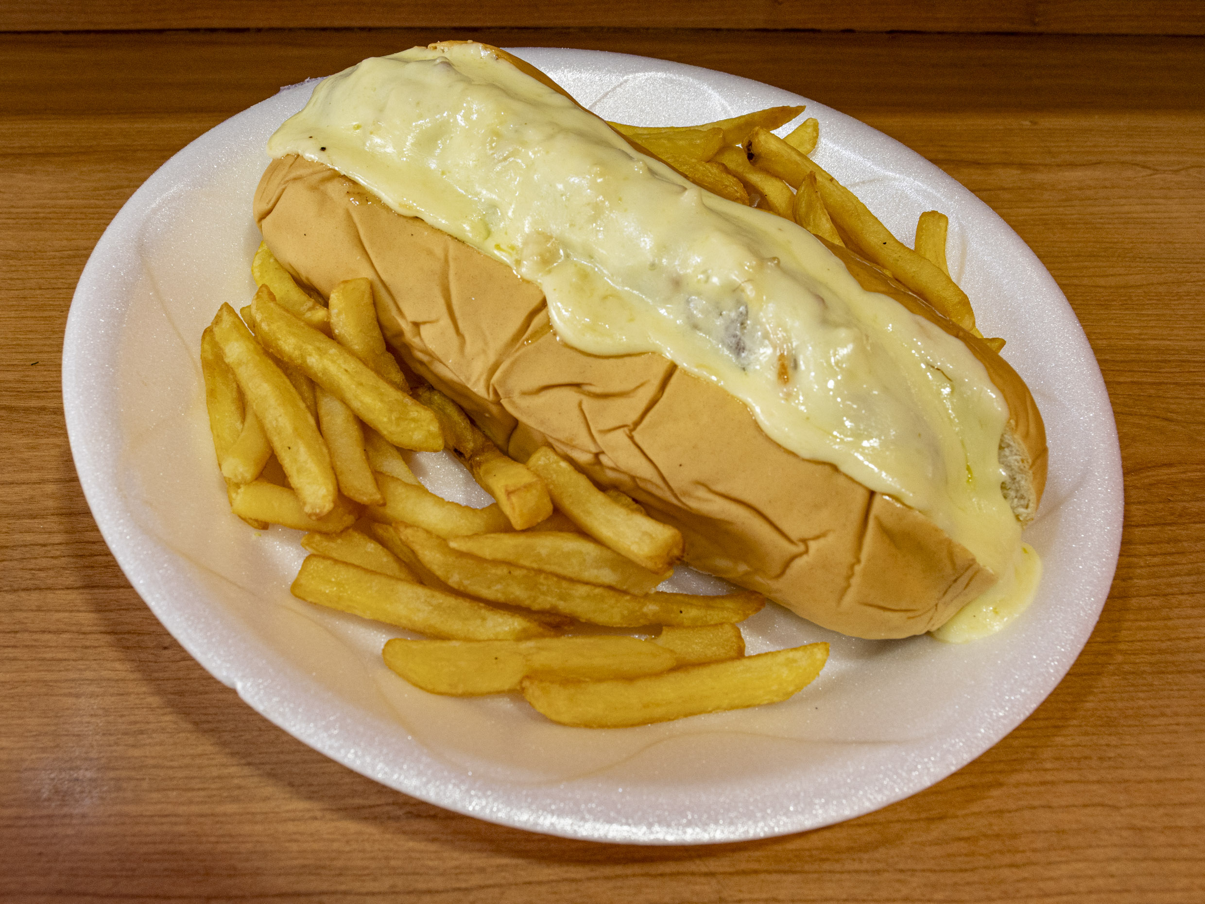 Salchicha suiza, queso, papa francesa.