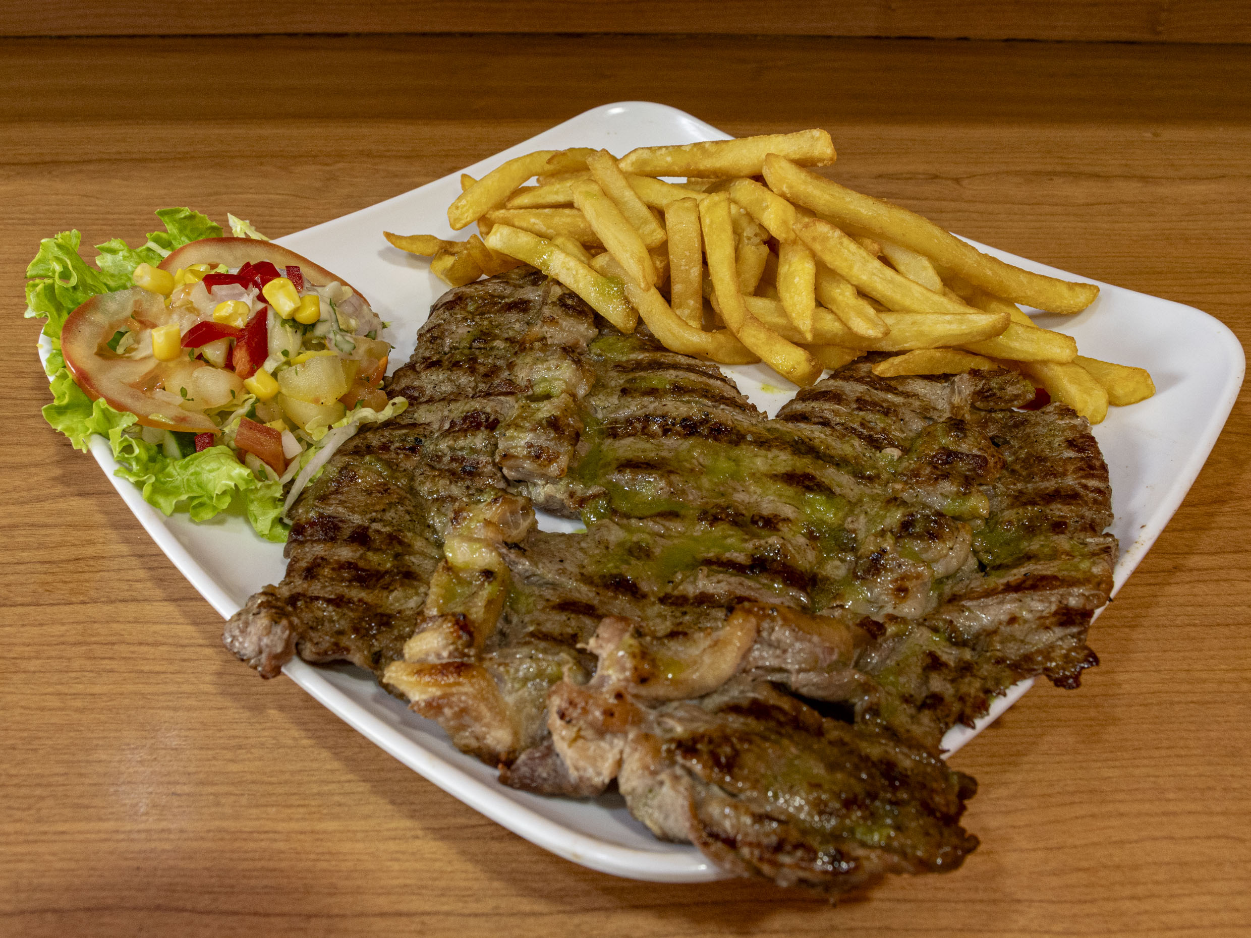 Churrasco 300 g, papa francesa 200 g, ensalada, 1 bollo de maíz.