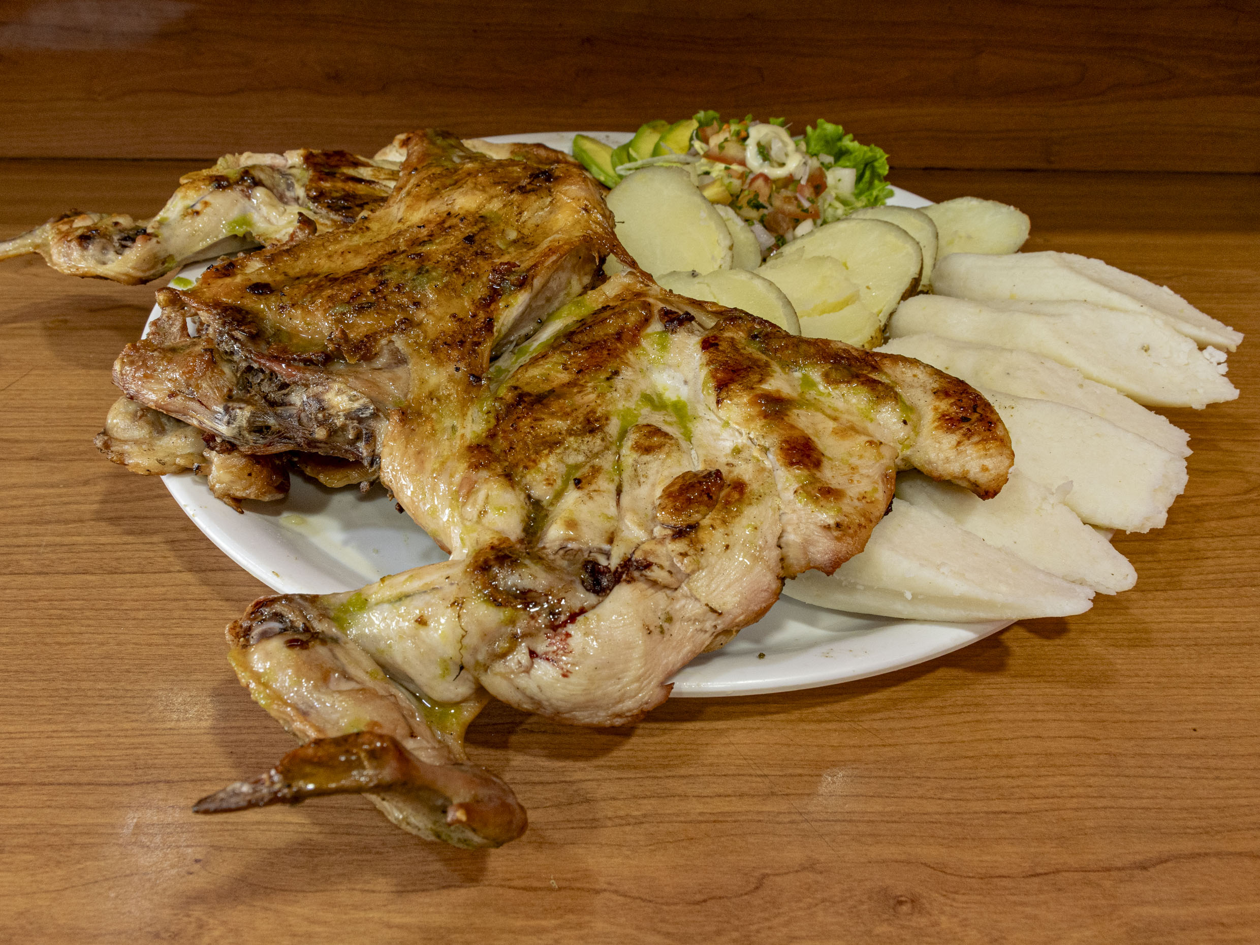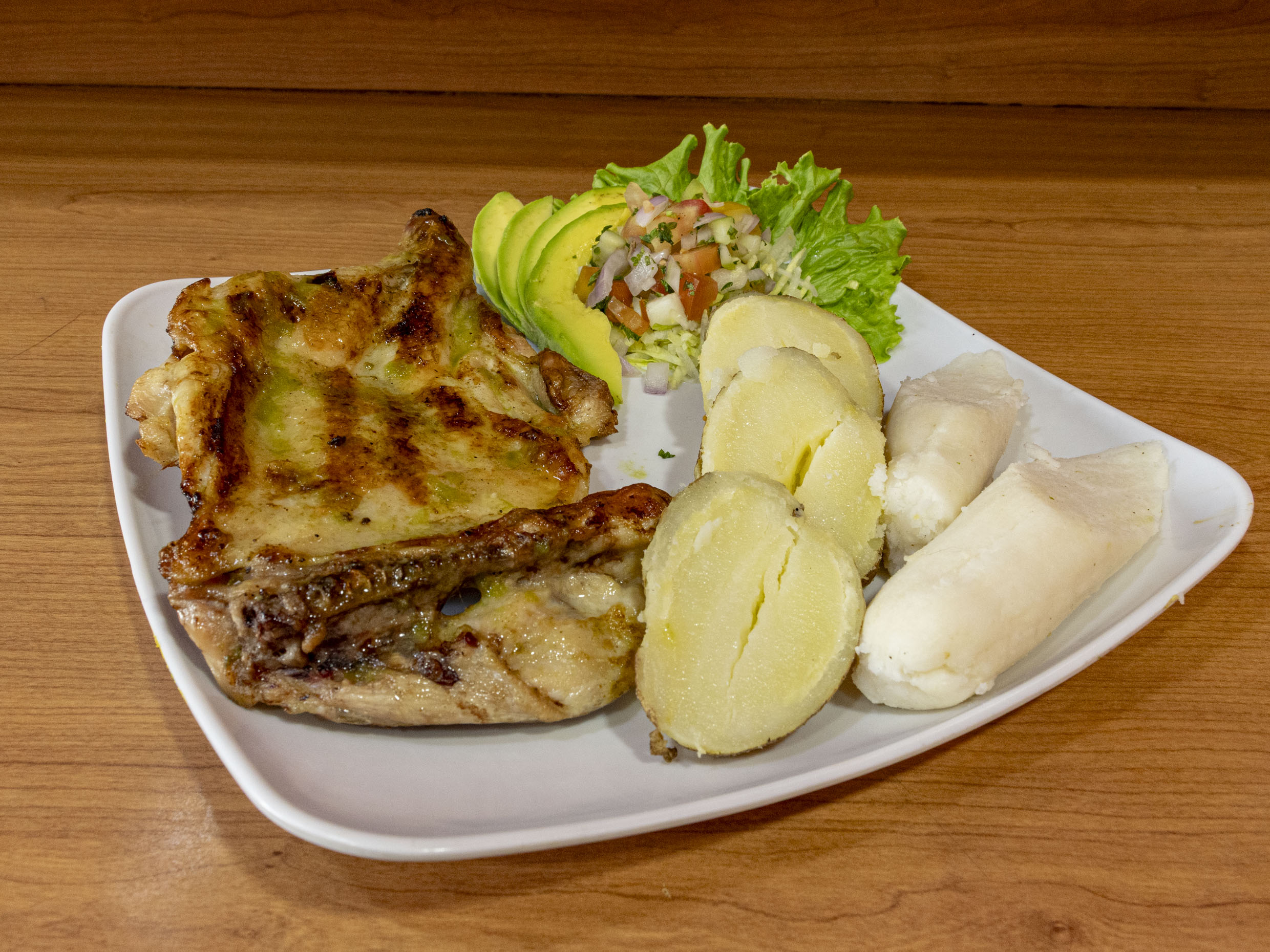 Pechuga 300 g, papa francesa 200 g, ensalada, 1 bollo de maíz.