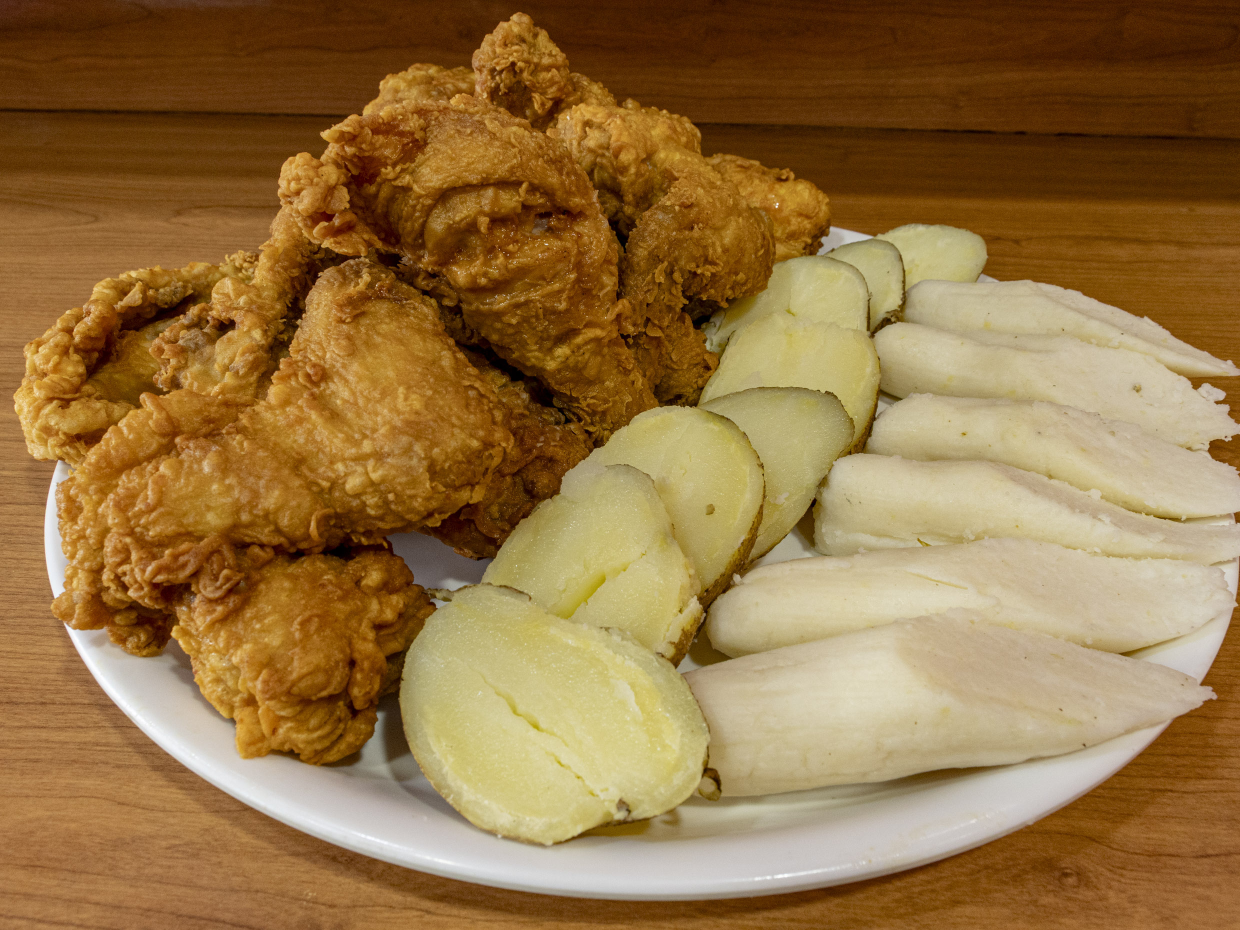 1 Pechuga, 1 tetafula, 1 lomo de cerdo, bollos, papa cocida.