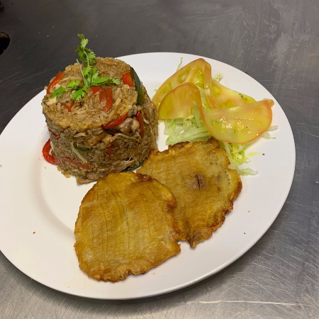 mojarra grande, arroz, patacon, sopa y ensalada