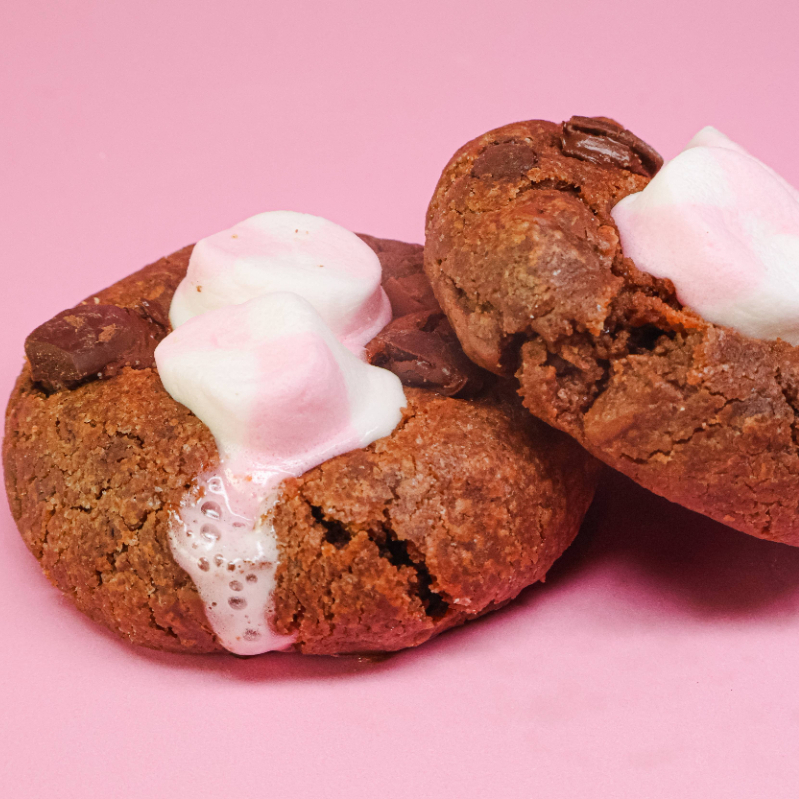 Una galleta con la personalidad de un brownie y una explosión de chocolate con topping de masmelo.