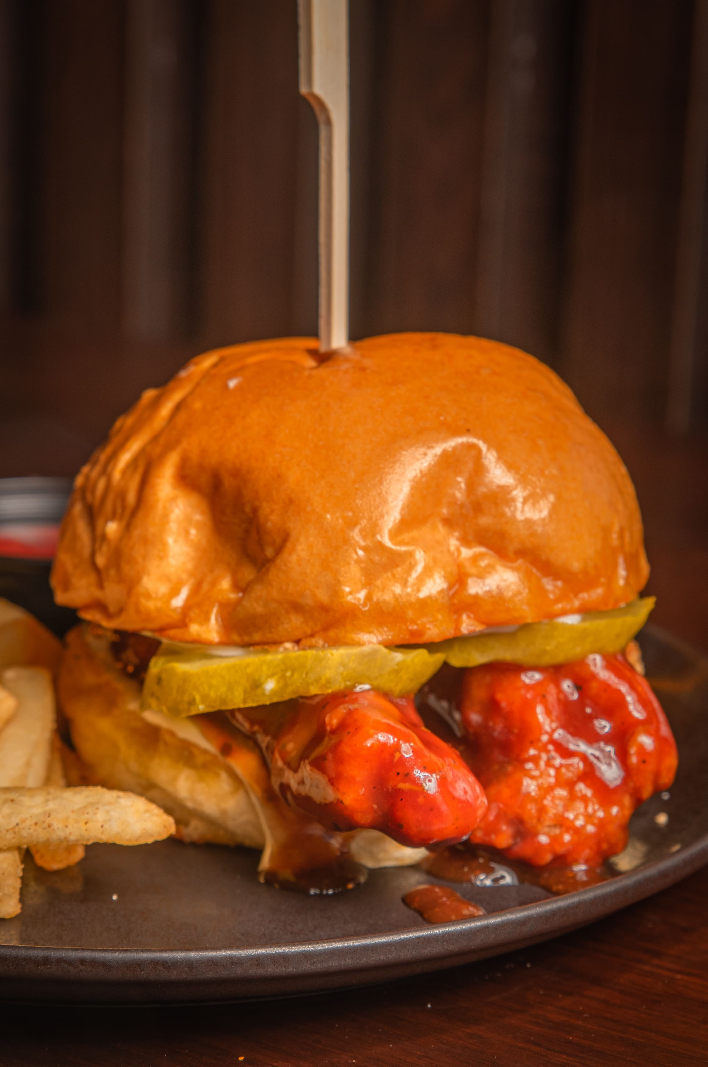 Pan brioche Chicken tenders , 1 salsa a elección, 1 aderezo a elección pepinillos, 90gr de bastones de papa y salsa de tomate.