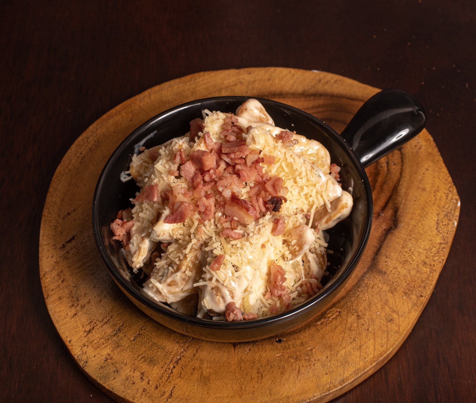 Cascos de papa bañados en salsa ranch con queso parmesano y tocineta.