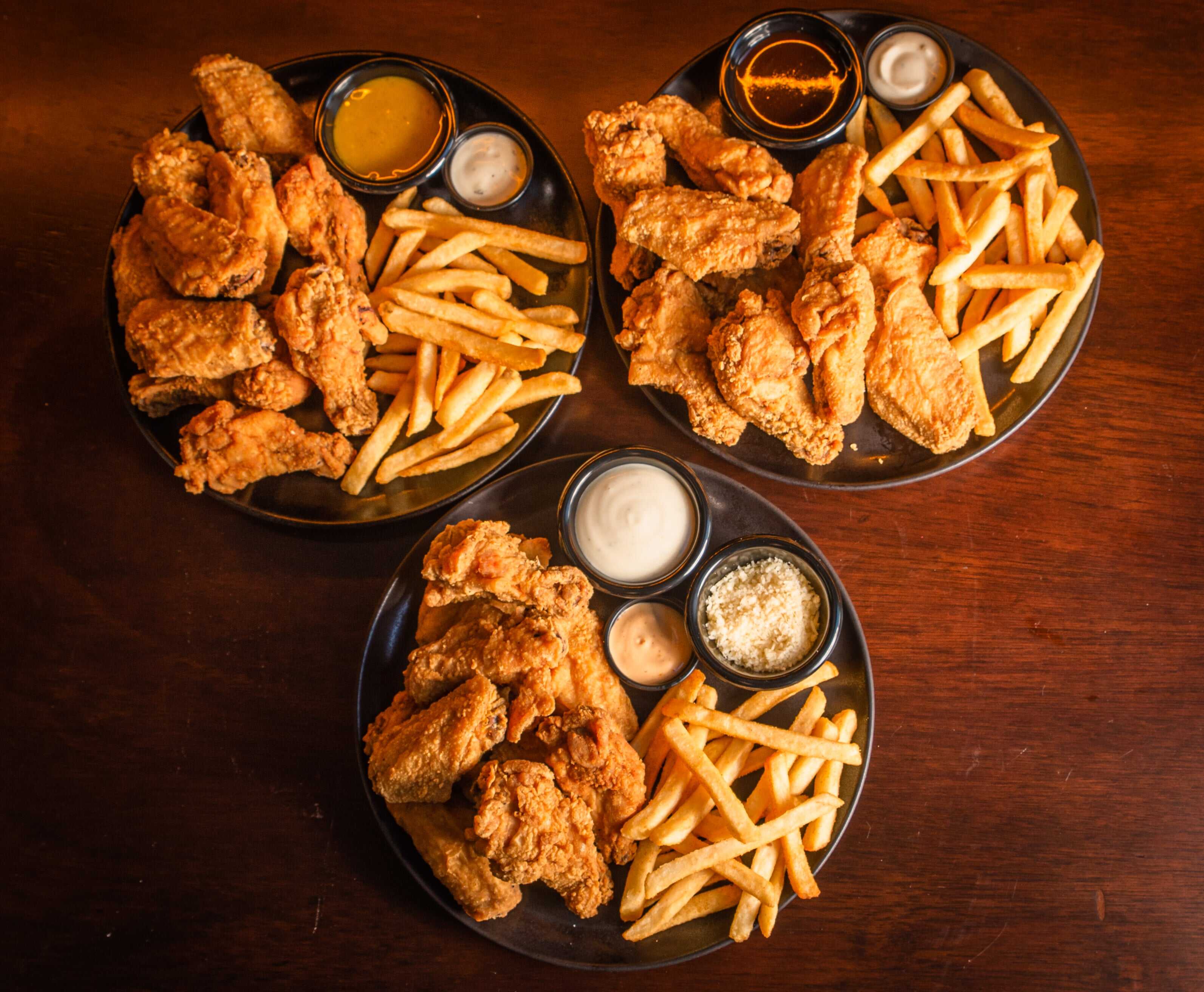 30 Piezas de alitas , salsa a elección, 270 gr de bastones de papa, salsa Ranch, Mayochipotle o de tomate, 20 gr de apio y zanahoria.