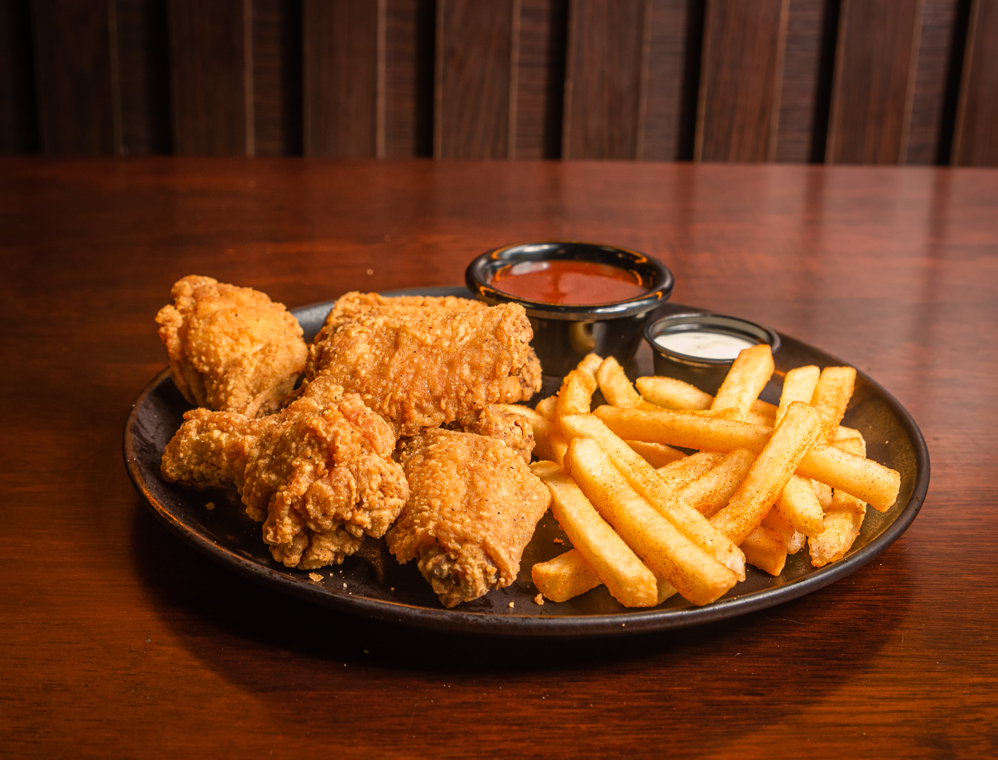 6 Piezas de alitas , salsa a elección, 90 gr de bastones de papa, salsa Ranch, Mayochipotle o de tomate, 20 gr de apio y zanahoria.