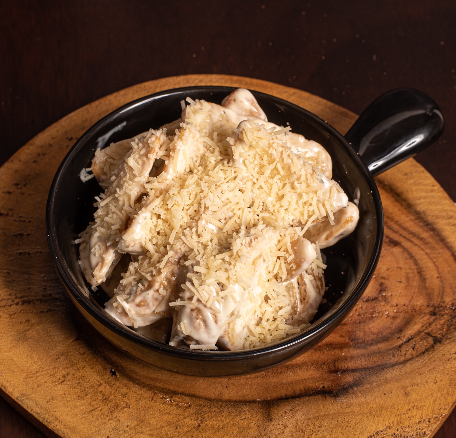 Cascos de papa bañados en salsa de ajo con parmesano.