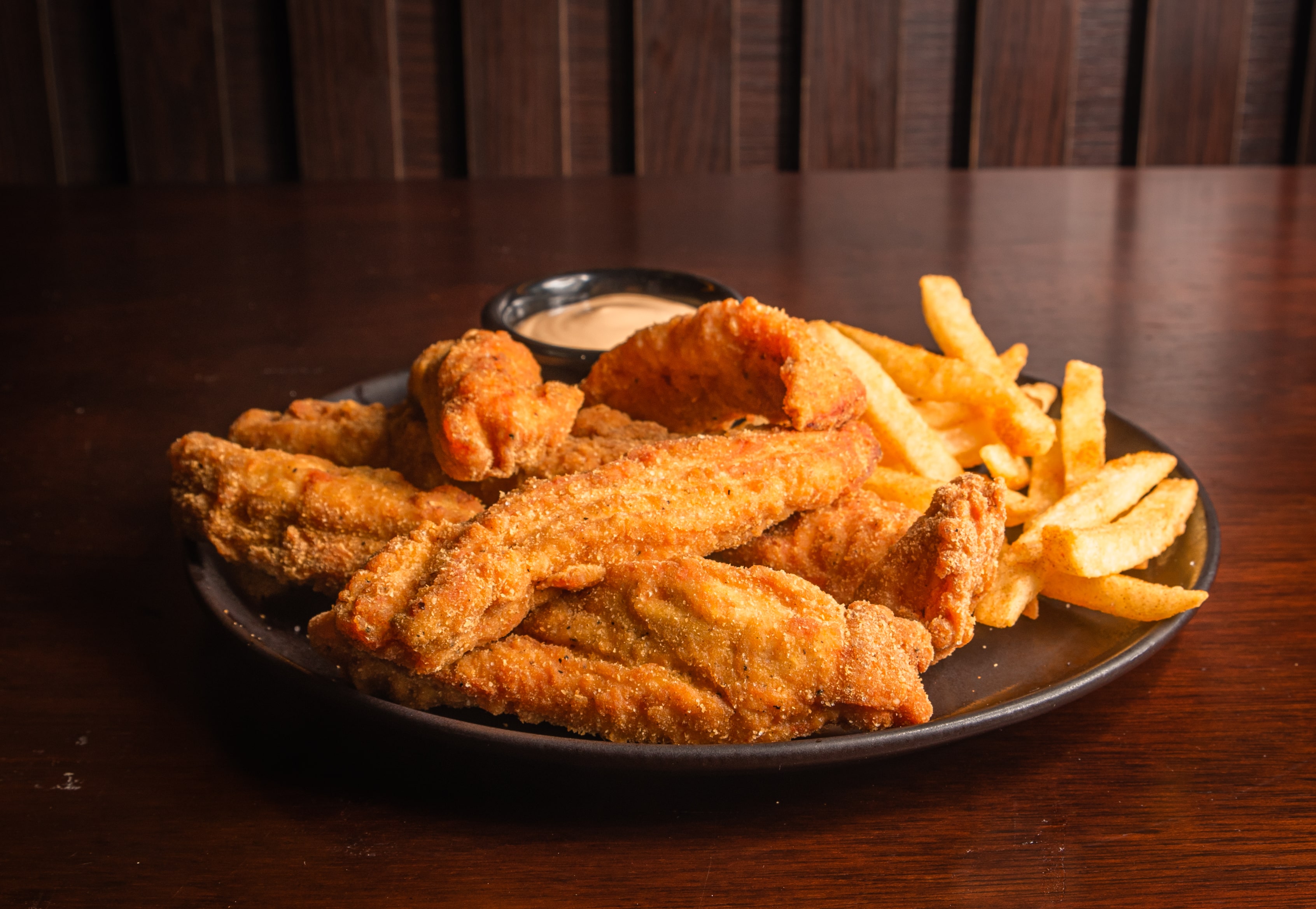 350 gr de tiras de pechuga de pollo, salsa a elección, 90 gr de cascos de papa, salsa Ranch o Mayochipotle o de tomate. 20 gr de Apio y zanahoria.