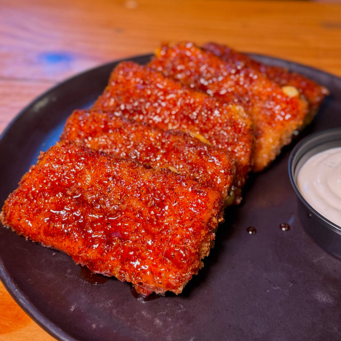 360 gr de cubos de pechuga de pollo apanados bañados en salsa Sweet BBQ, 90 gr bastones de papa, salsa Ranch o mayochipotle o de tomate.