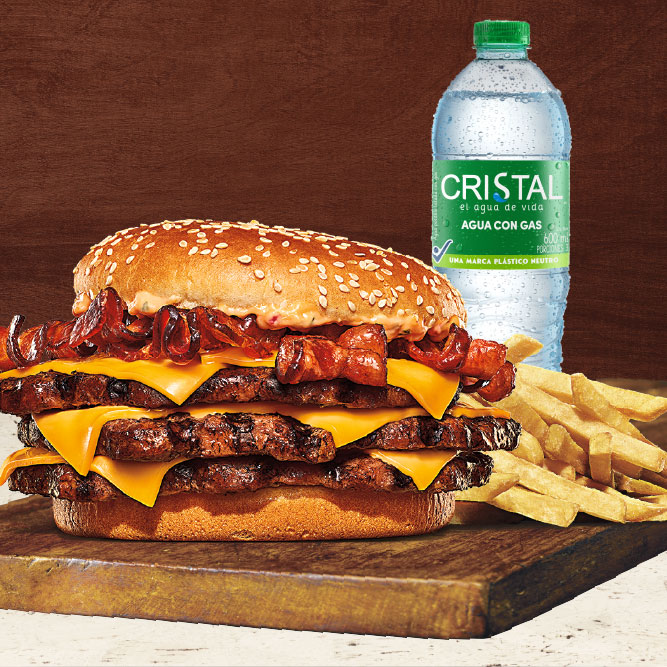 Nuestra Megastacker Triple cuenta con (3) carnes de res 113gr C/U a la parrilla, queso, abundante tocineta crujiente y deliciosa salsa stacker sobre un pan con ajonjolí tostado perfectamente + (1) porción mediana de 82gr de papas + (1) Bebida Pet de 400ml a tu eleccion.