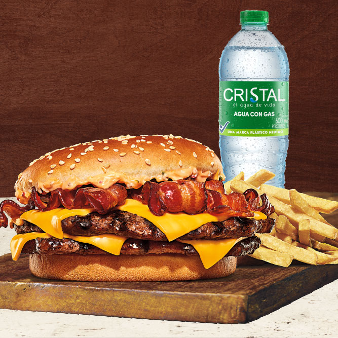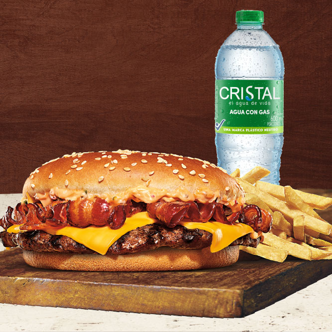Nuestra Bacon King cuenta con dos carnes 113 gr c/u de res a la parrilla, tocineta crujiente, queso americano, mayonesa sobre un pan con ajonjoli, tostado + (1) porción mediana de 82gr de papas + (1) Bebida Pet de 400ml a tu eleccion.