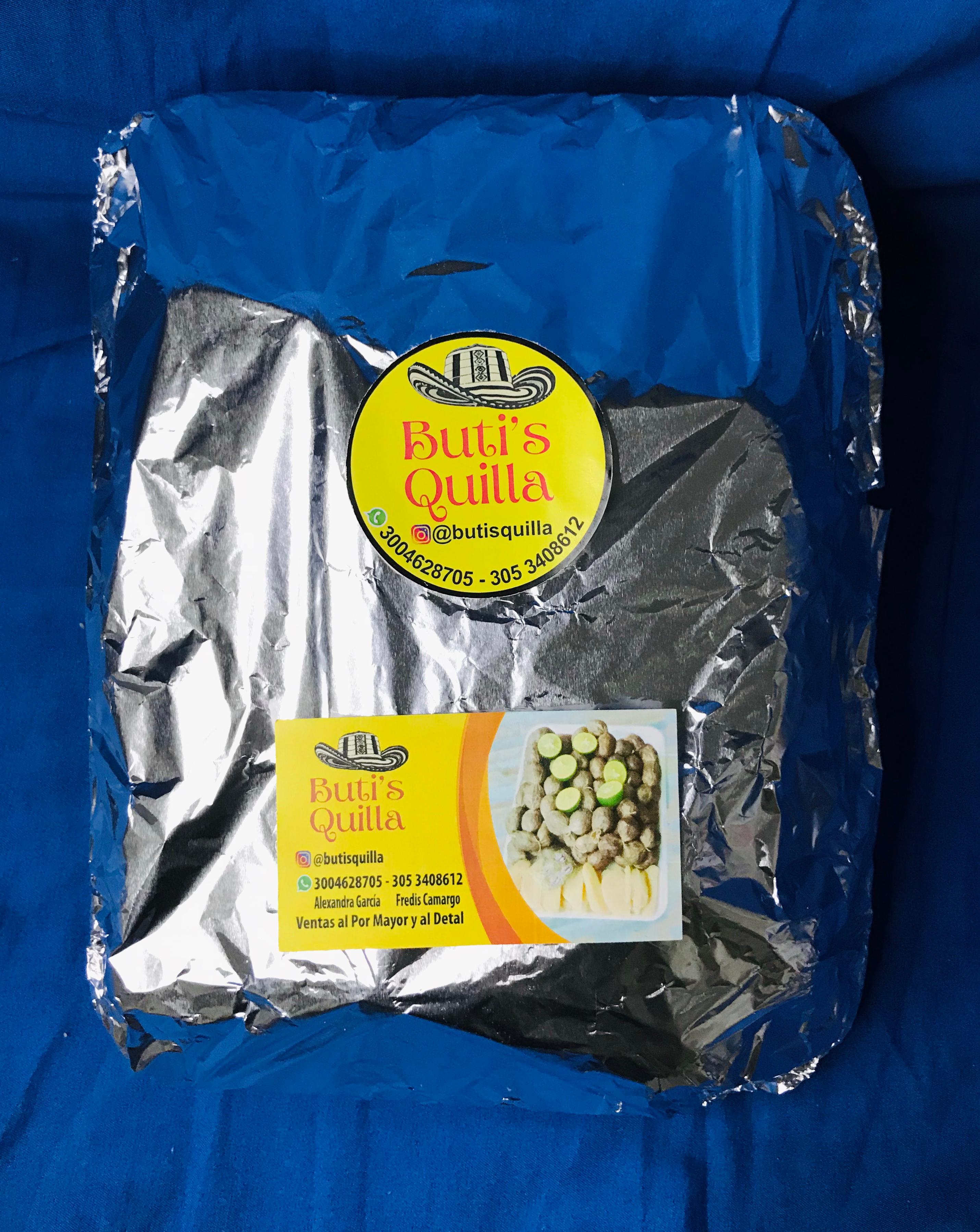 Bandeja de 100 deliciosas butifarras peladas de carne 100% de res acompañadas con bollo de yuca y limón.