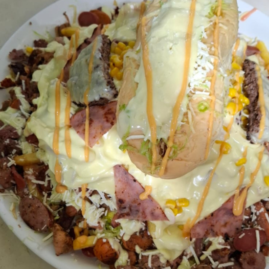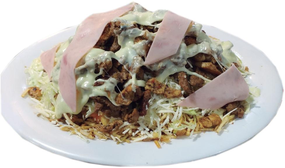 Papas a La Francesa, Salchicha, Pollo, Carne, Cerdo, Chorizo, Butifarra, Queso Mozzarella y Jamon. (Lechuga, Queso Costeño, Chongo, Salsa Tartara, Rosada y Piña)