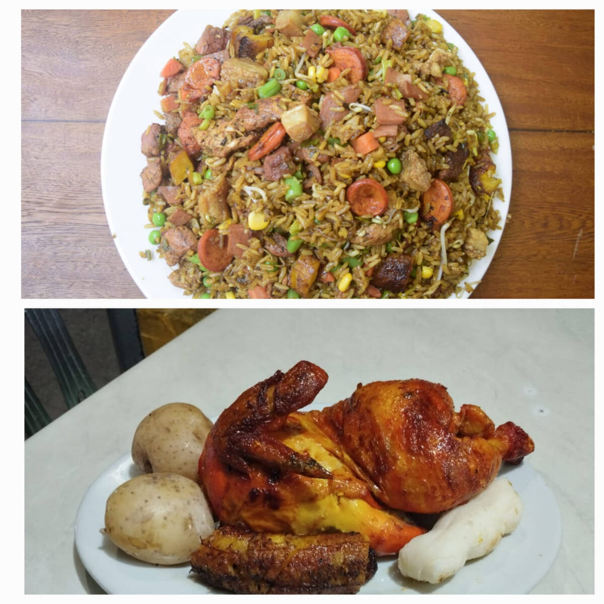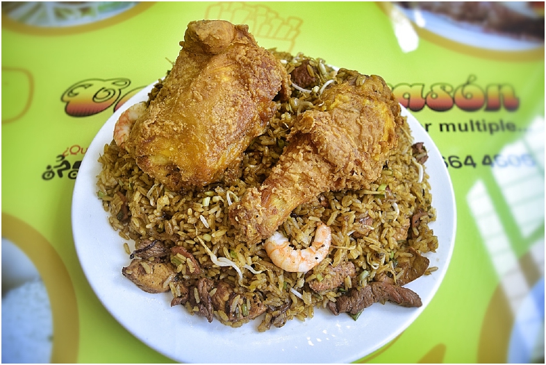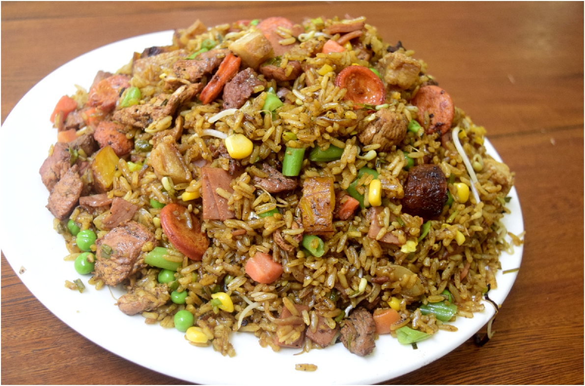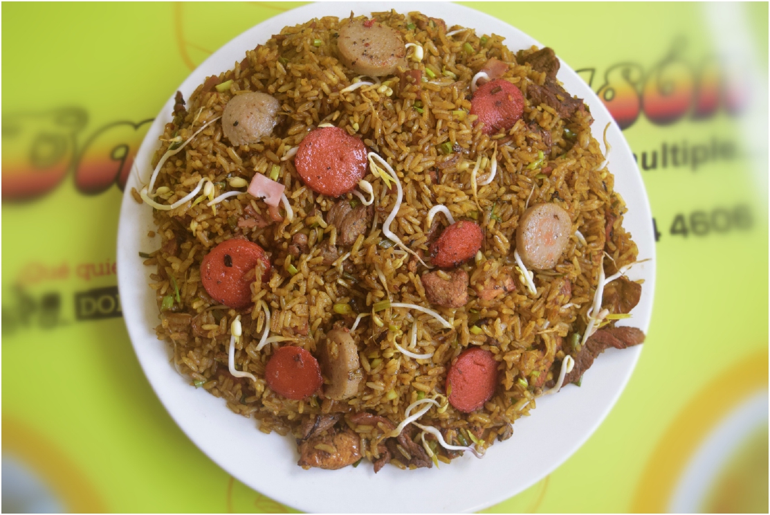 Arroz al wok, jamón, pollo, carne, cerdo, chorizo, chicharrón, maduro y maíz.