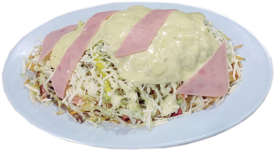 Papas a La Francesa, Salchicha, Carne, Queso Mozzarella, Jamon. (Lechuga, Queso Costeño, Chongo, Salsa Tartara, Rosada y Piña)