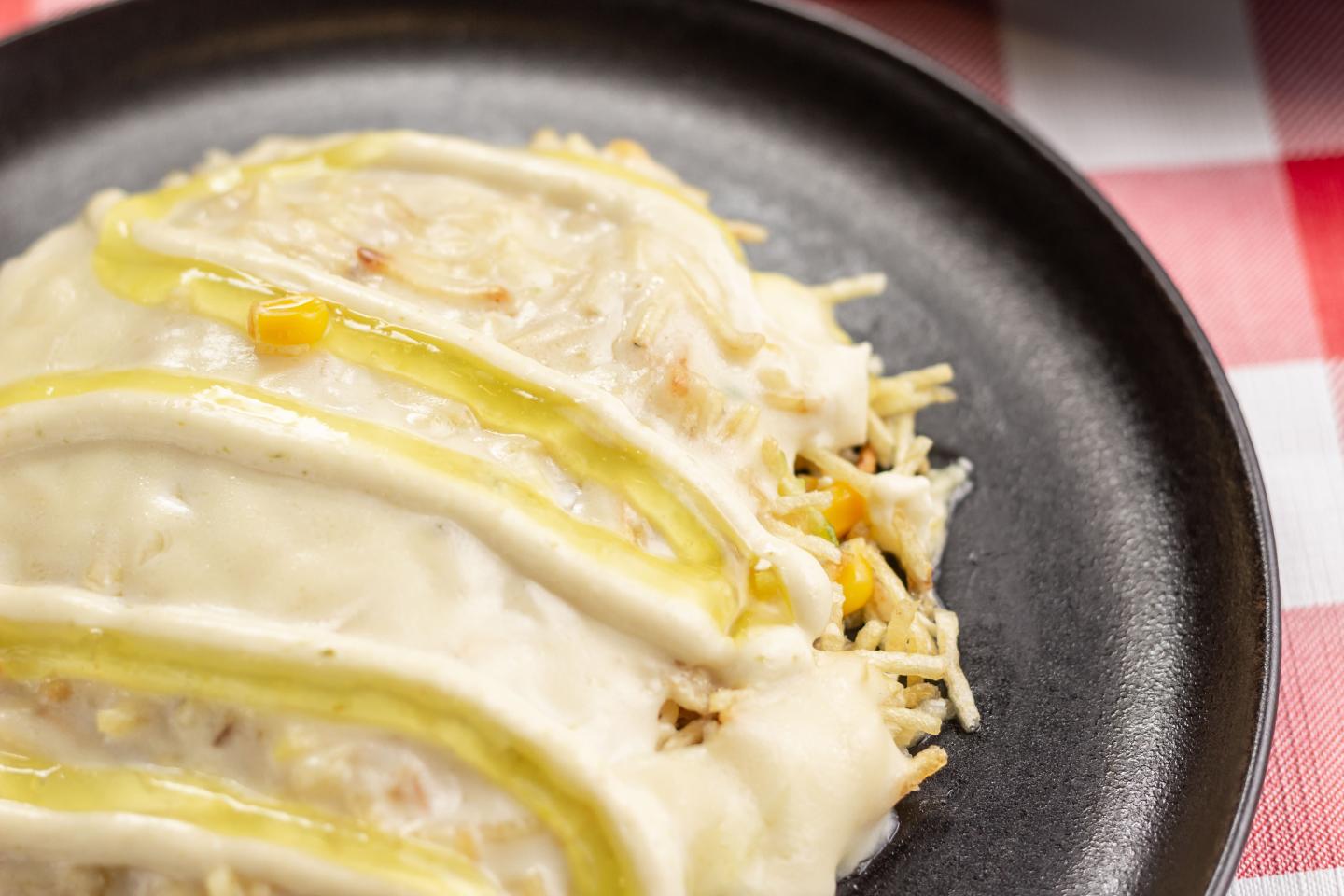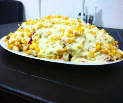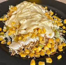 Maíz tierno, Pollo, Queso Mozzarella. (Chongo, Lechuga, Queso costeño, Salsa Tartara, Salsa Rosada y Salsa Piña)