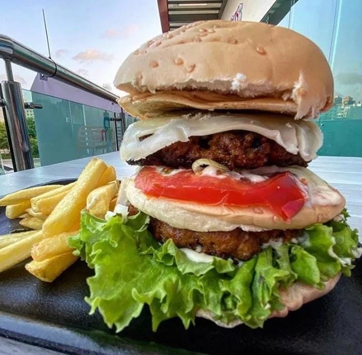 Doble Pollo, Queso Mozzarella, Jamon. (Tomate, Lechuga, Chongo, Salsa Tartara y Salsa Rosada)