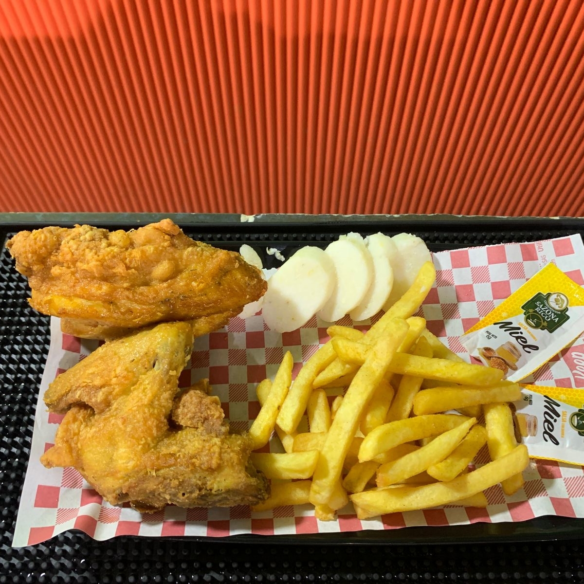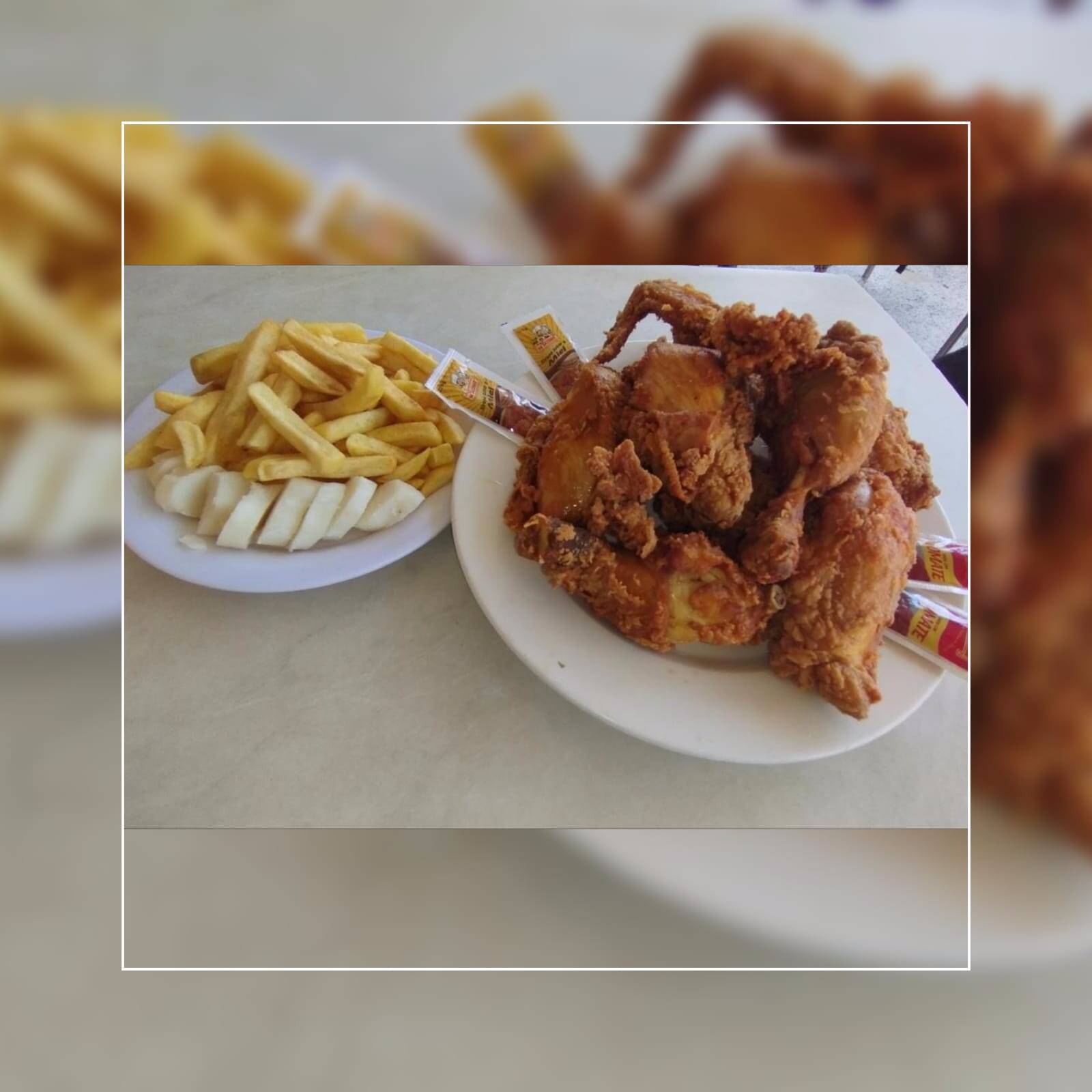 1 Pollo Broaster, Papa Francesa y Bollo. (Salsa Miel y Salsa de Tomate)
