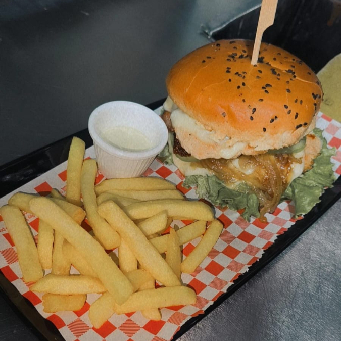pan brioche, 130 gr de pollo de la casa, tomate verde, lechuga crespa, cebolla carmelizada, chongo, mozzarella, jamon y papa francesa