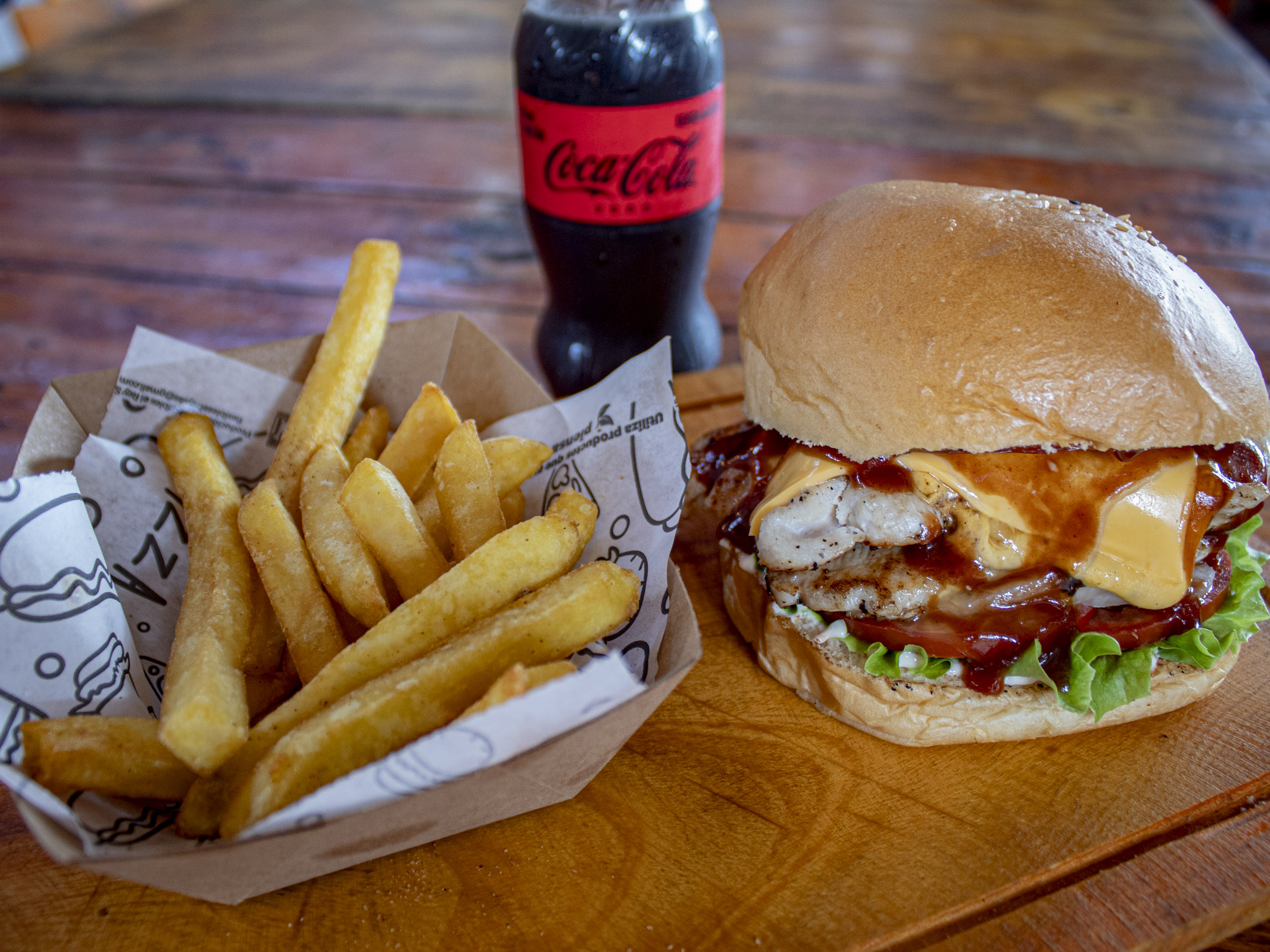 70 g De pollo desmechado bañado en tártara, tocineta, mozzarella, lechuga, tomate, cebolla, salsa tártara, BBQ, piña mas papas a la francesa y bebida 250 ml.