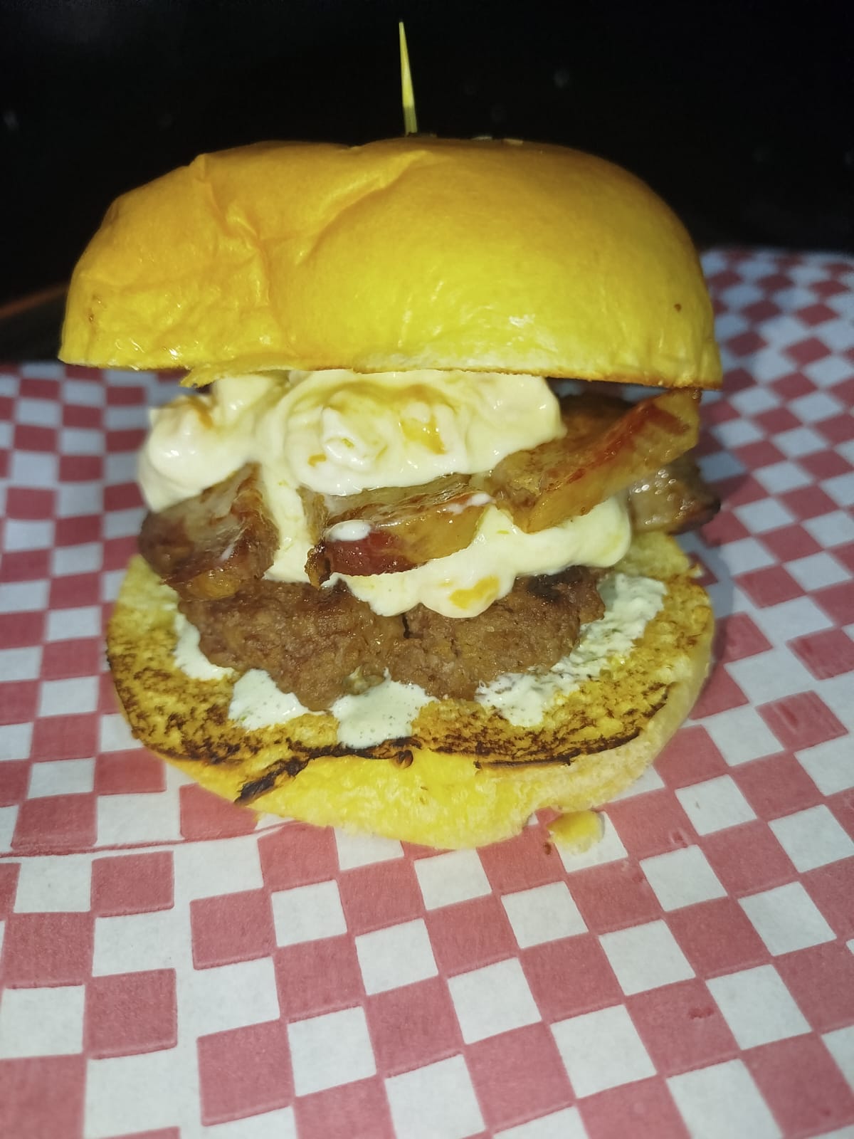 Hamburguesa de bondiola. Carne Angus, bondiola al barril, queso mozzarella, pan brioche y deliciosa salsa de la casa.