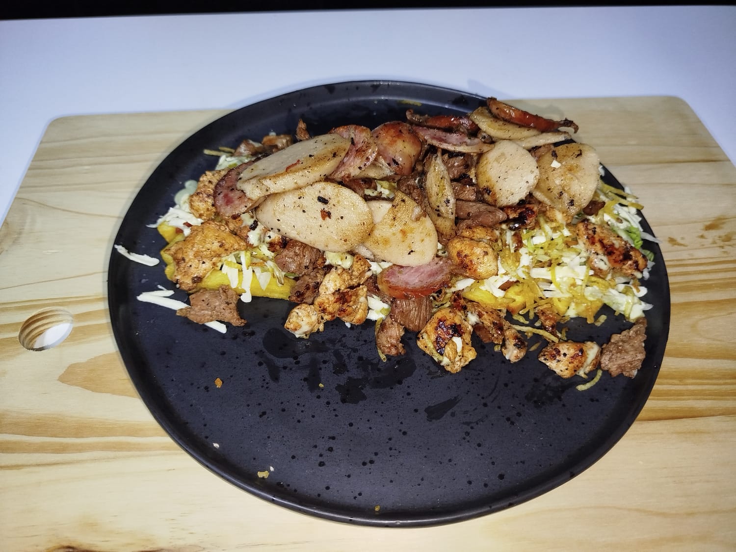 Pollo, carne, chorizo y butifarra, lechuga y salsa de la casa.