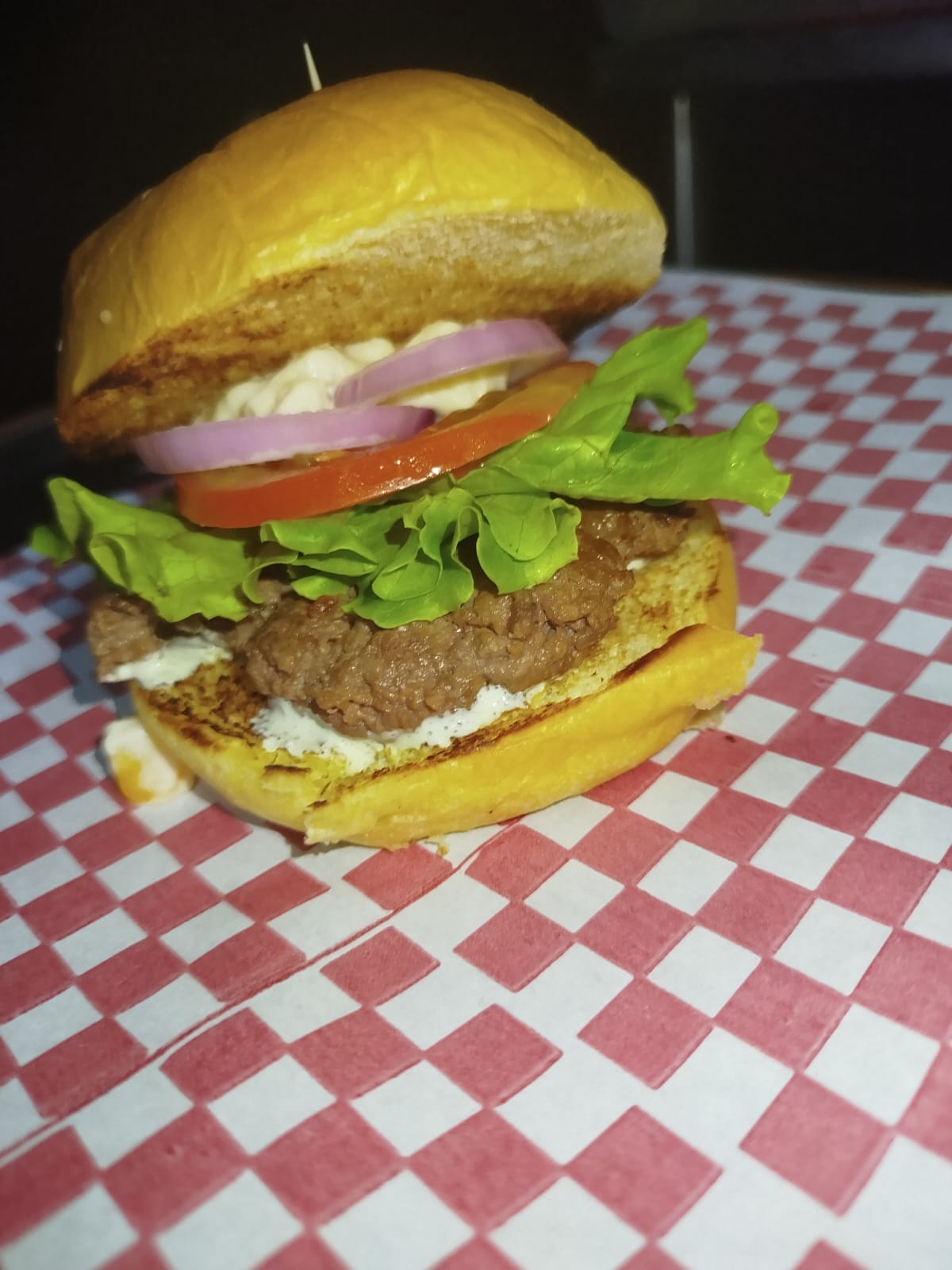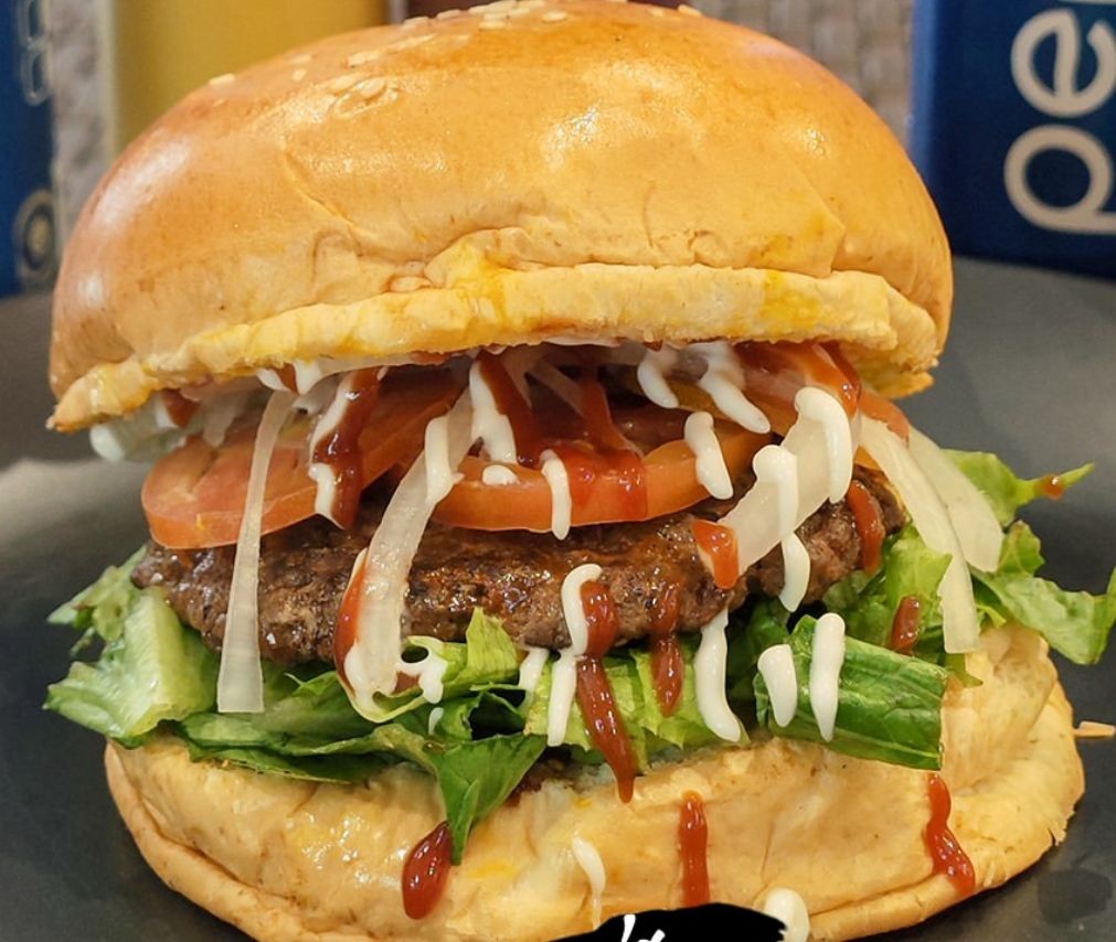 Dos deliciosos panes artellanos acompañados de Carne de res hecha al grill, lechuga, tomate, cebolla caramelizada y nuestra deliciosa salsa de la casa.