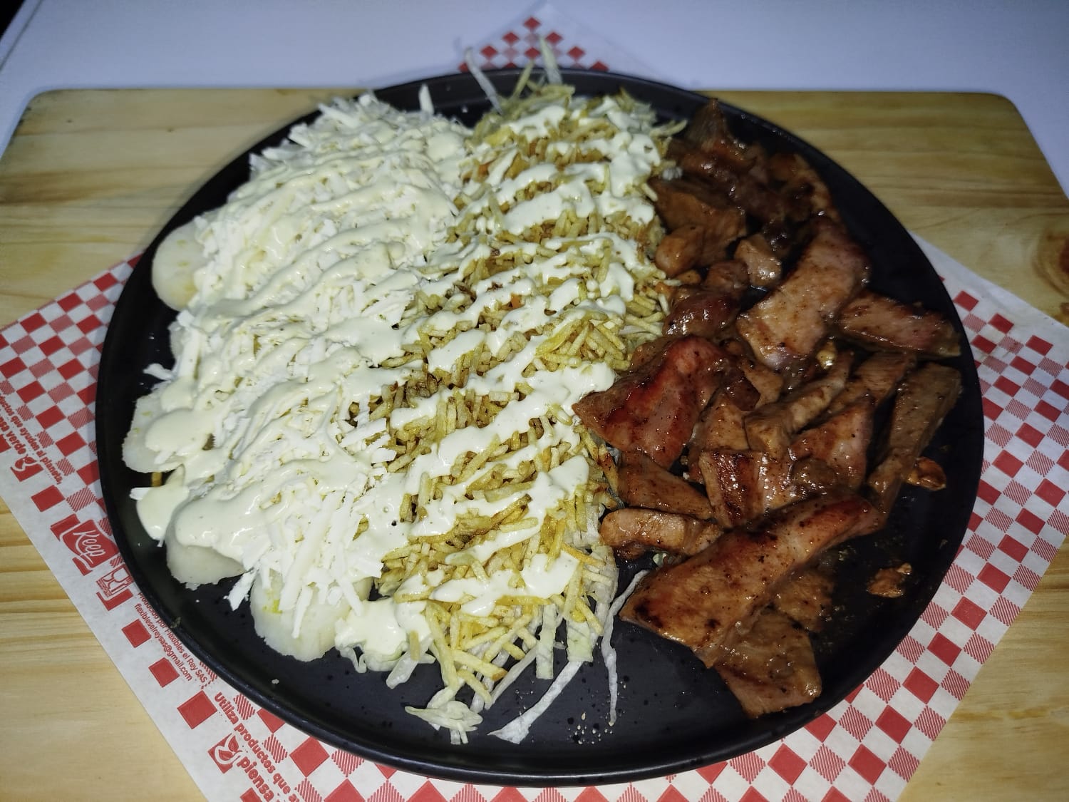 Pollo, carne, queso costeño, papa chongo, lechuga y deliciosa salsa de la casa.