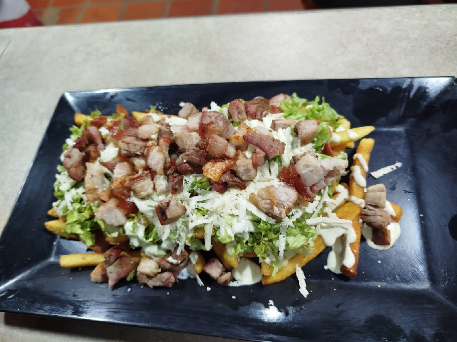 Salchi chicharrón. Papas a la francesa, lechuga, chicharrón al barril y deliciosa salsa de la casa.