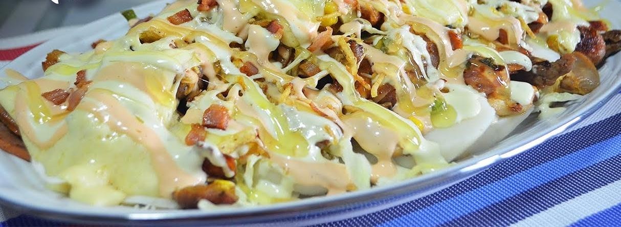 Papas a la francesa, salchicha, pechuga de pollo, chorizo y butifarra lechuga queso costeño, chongo, y nuestra especial salsa de la casa, tártara, piña, mozzarella gratinado con maíz.