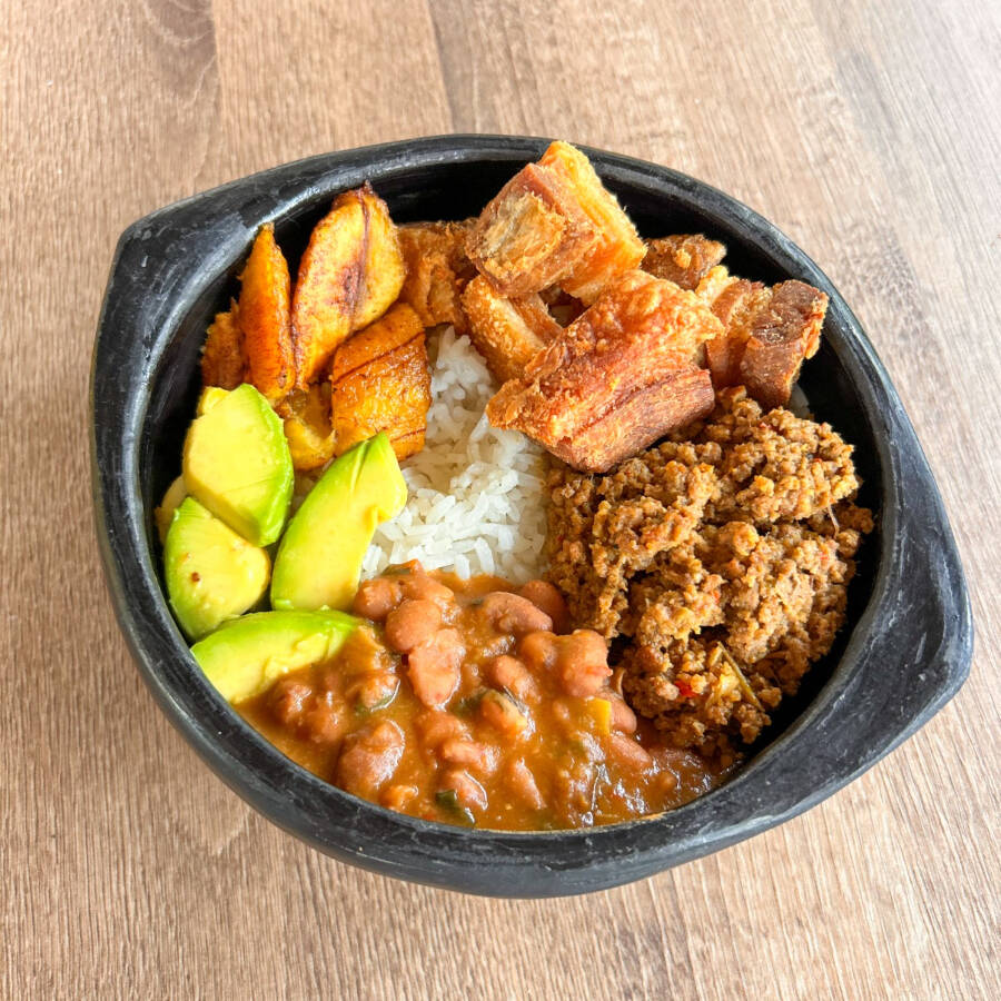 Acompañado de chicharron, a elegir carne molida o desmechada, yuca o bollo y arepa vallenata.