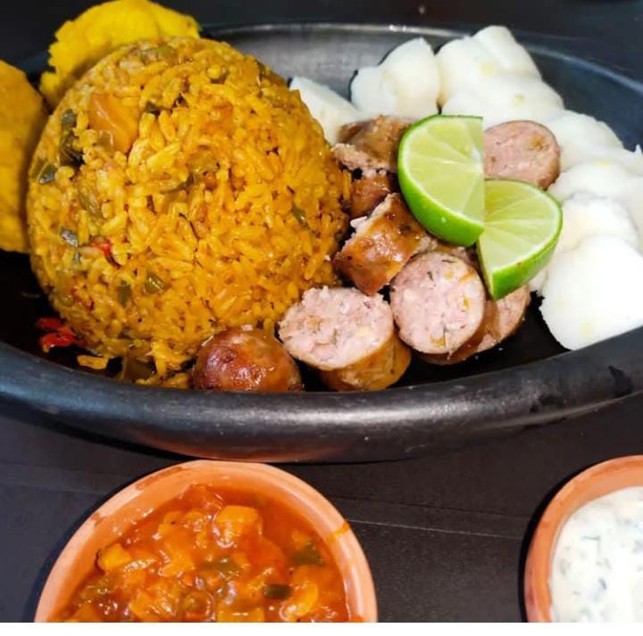 Arroz de 700gr, salteado con vegetales, patacones, cerdo, pollo y chorizo artesanal,