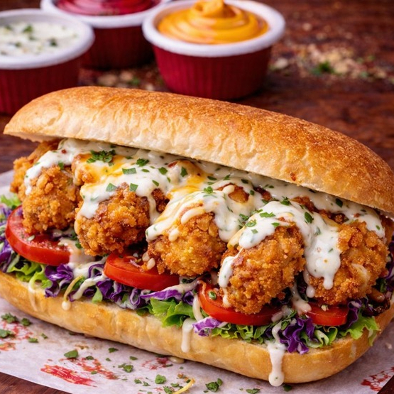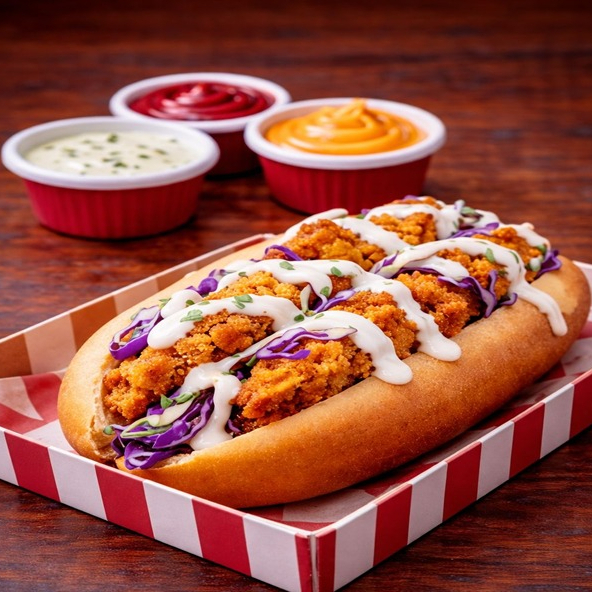 Bollo limpio picado y sellado en mantequilla, servido con trozos de pechuga tender y bañado en nuestra cremosa salsa ranch.