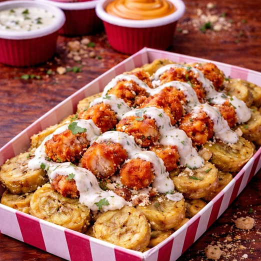 Tradicional guineo verde acompañado de pollo tender en trozos y nuestra salsa de la casa estilo ranch.