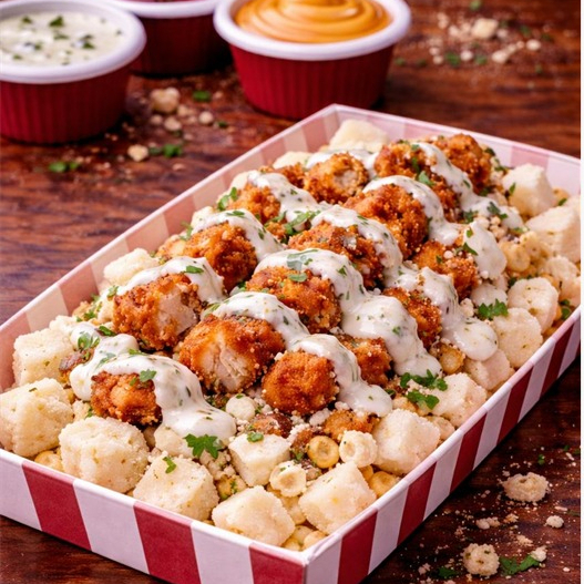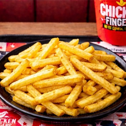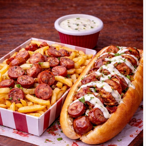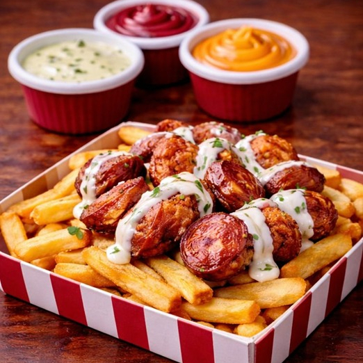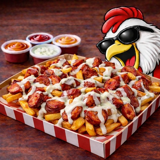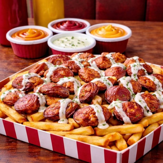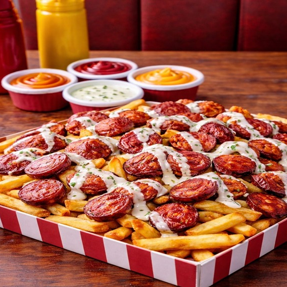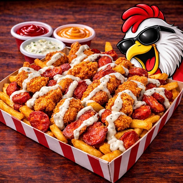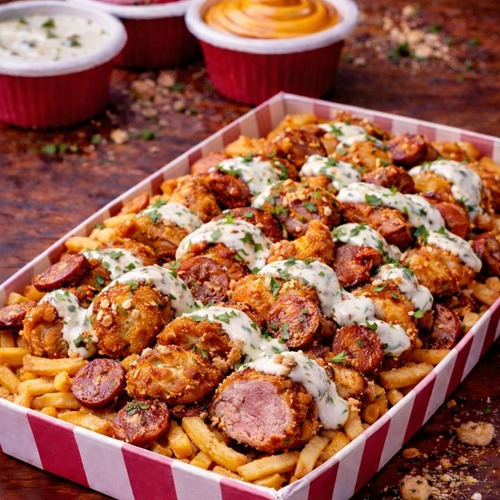 Mix de papas francesas, pollo tender con salsa street y chorizo de cerdo a la parrilla con salsa ranch.