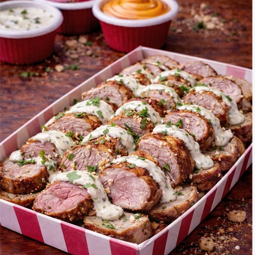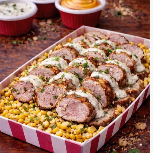 Maíz tierno a la parrilla con trozos de lomo de cerdo al chimichurri y salsa ranch.
