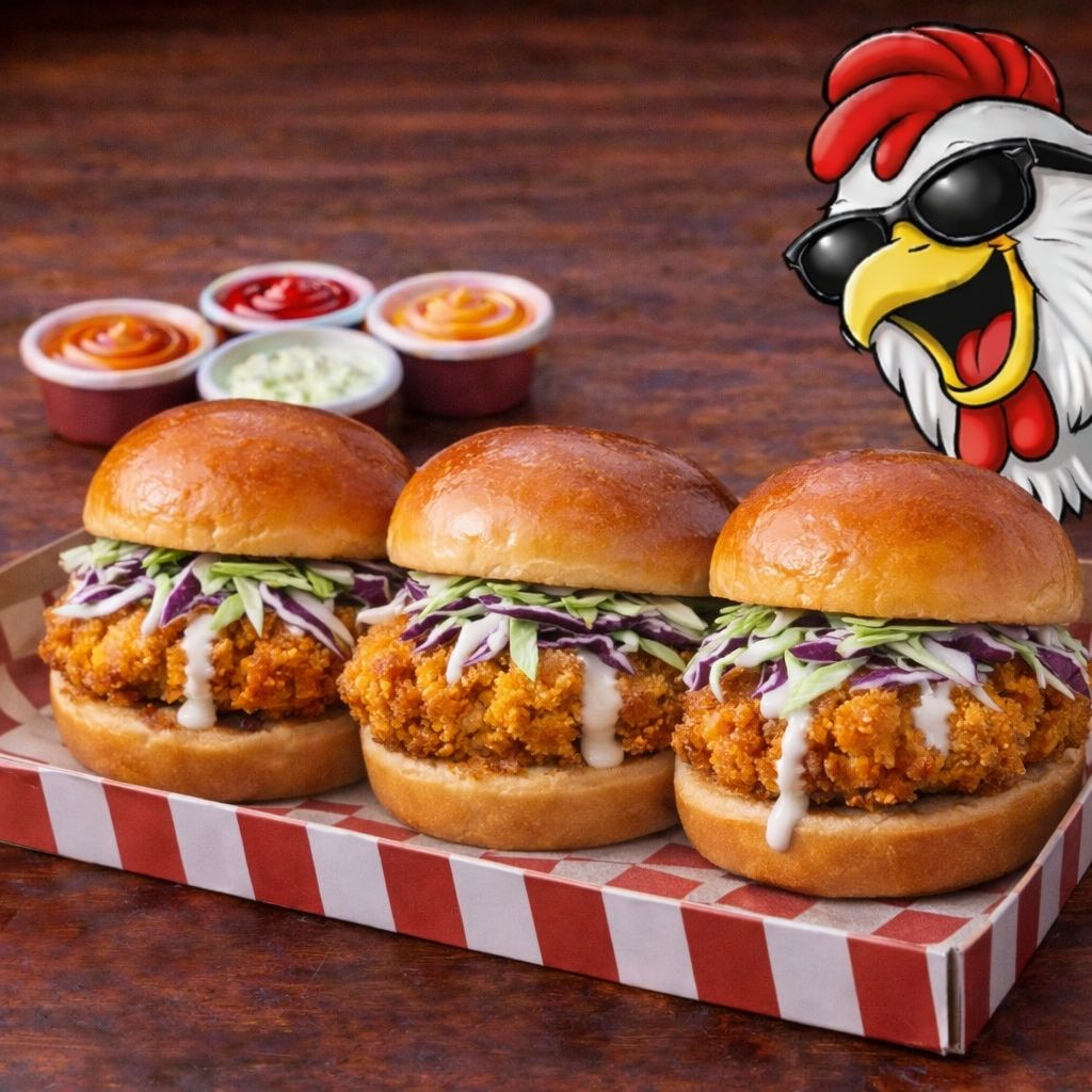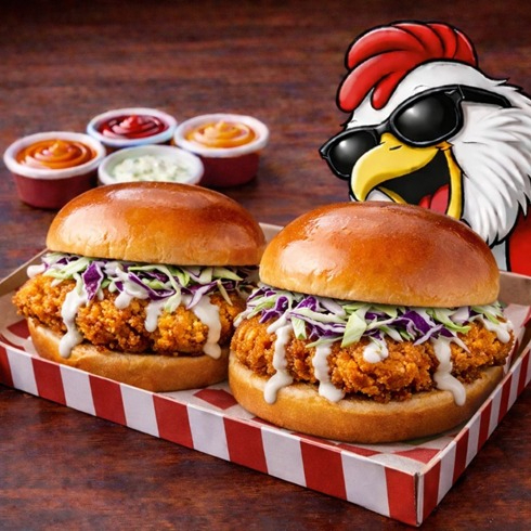 Duo de pollo: 2 hamburguesas de pan artesanal con pollo tender apanado y crujiente, bañadas en salsa BBQ, lechuga y nuestra exclusiva salsa ranch de la casa.