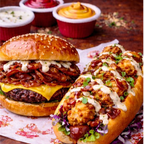 Hamburguesa de cebolla caramelizada con tocineta tostada y quesos y perro artesanal de pollo tender y repollo morado.